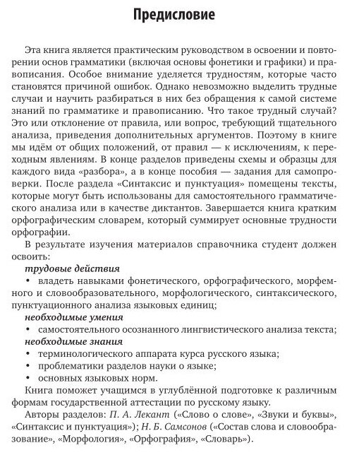 Справочник по русскому языку является практическим руководством в освоении и повторении основ грамматики (включая основы фонетики и графики) и правописания. Издание содержит определения и правила, которые иллюстрируются примерами из художественных произведений, а также орфографический словарь. Особое внимание уделяется трудностям, которые часто становятся причиной ошибок. Книга поможет учащимся в углубленной подготовке к различным формам государственной аттестации по русскому языку.