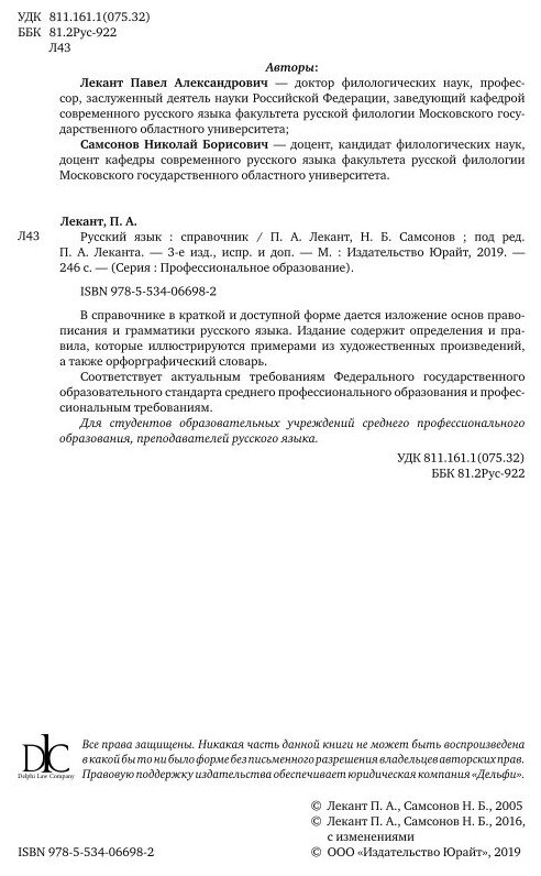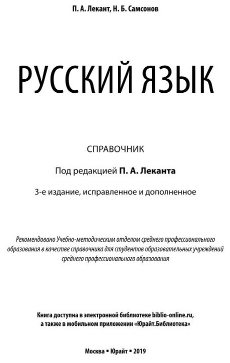 Русский язык 3-е изд. испр. и доп. Справочник для СПО (Лекант Павел Александрович; Самсонов Николай Борисович); ЮРАЙТ, 2019