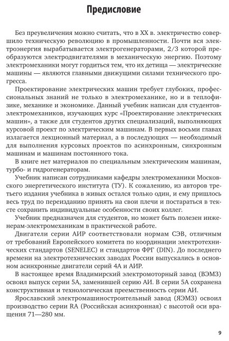 Рассмотрены электромагнитные, тепловые, вентиляционные и механические расчеты асинхронных, синхронных машин и машин постоянного тока. Приведены примеры расчетов электрических машин новых серий. Даны необходимые справочные материалы для выполнения курсовых и дипломных проектов. В четвертом издании (3-е – 2002 г.) приведены материалы по новым сериям электродвигателей. Соответствует Федеральному государственному образовательному стандарту высшего профессионального образования третьего поколения. Для студентов электротехнических и энергетических специальностей. Может быть полезен инженерам, специализирующимся в области проектирования и эксплуатации электрических машин.