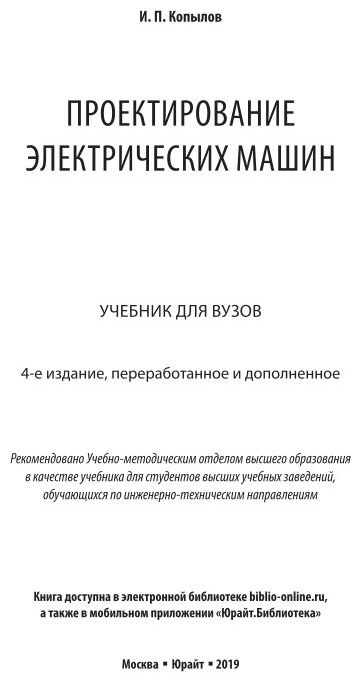 Проектирование электрических машин 4-е изд. пер. и доп. Учебник для вузов (Игорь Петрович Копылов); ЮРАЙТ, 2019