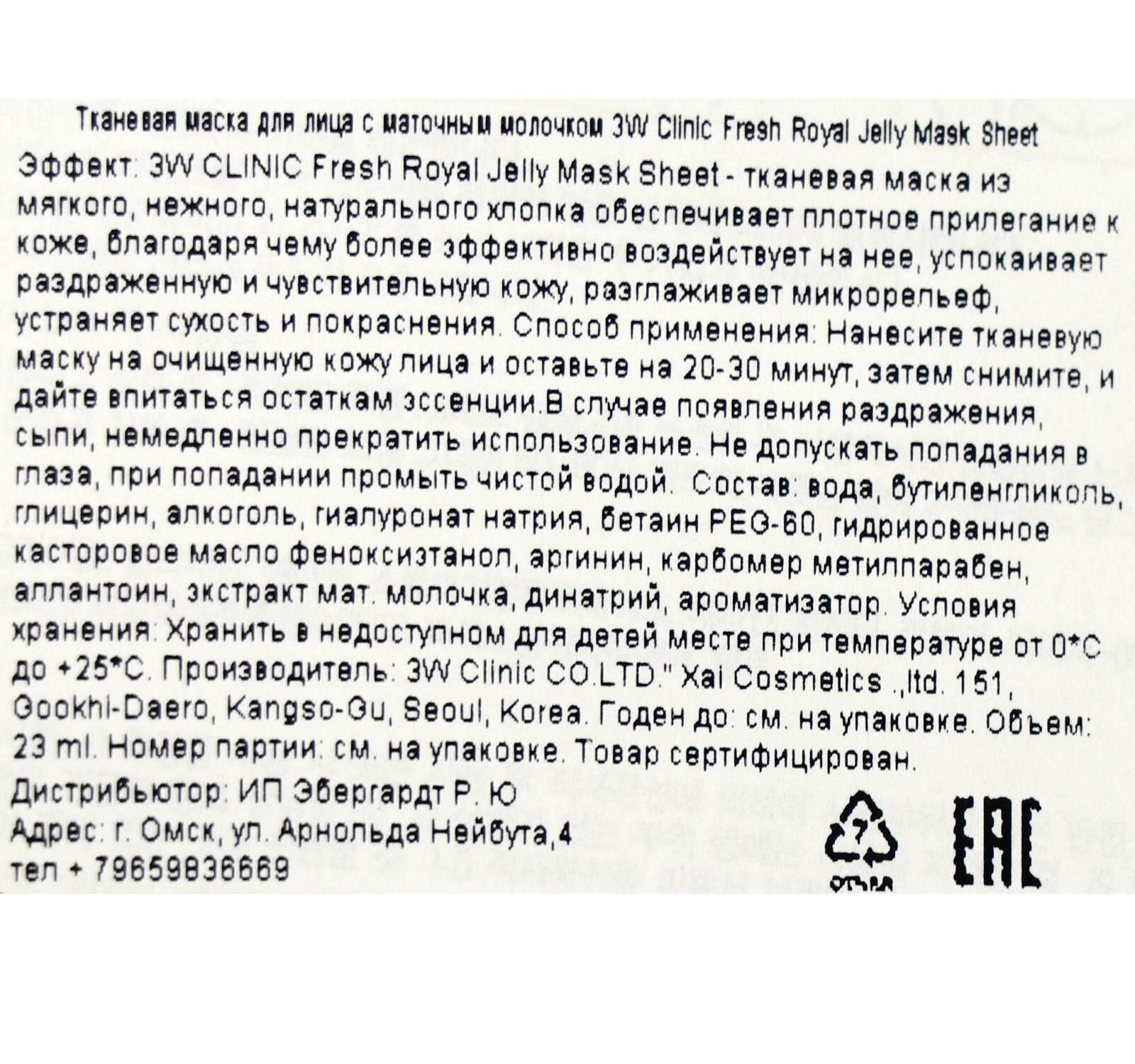 Маска для лица 3W Clinic Fresh Royal Jelly Mask Sheet 23 мл
