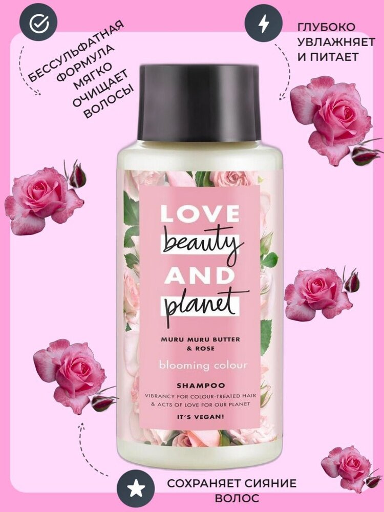 Пусть жизнь наполняется яркими красками! Больше не нужно бояться, что волосы потускнеют после мытья. Шампунь Цветущий Цвет Love Beauty and Planet создан, чтобы сохранить любимый оттенок и сияние твоих волос. Главный ингредиент средства — масло мурумуру. Его добывают из мякоти орехов пальмы мурумуру и ценят за способность глубоко увлажнять и смягчать за считанные секунды. Экстракт лепестков Болгарской розы наполнит локоны тёплым цветочным ароматом.