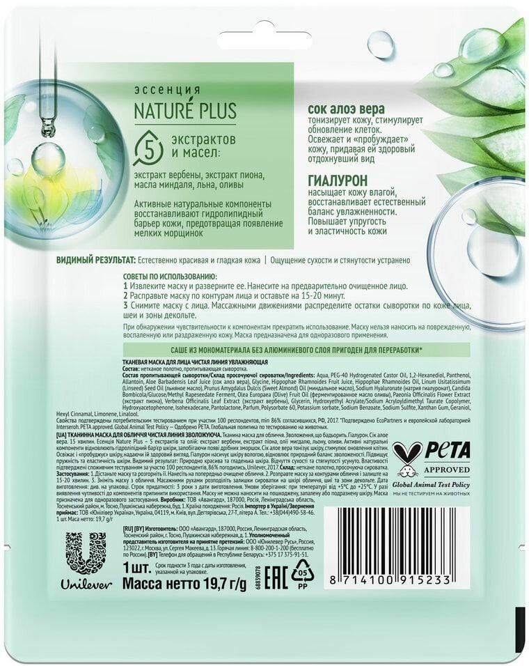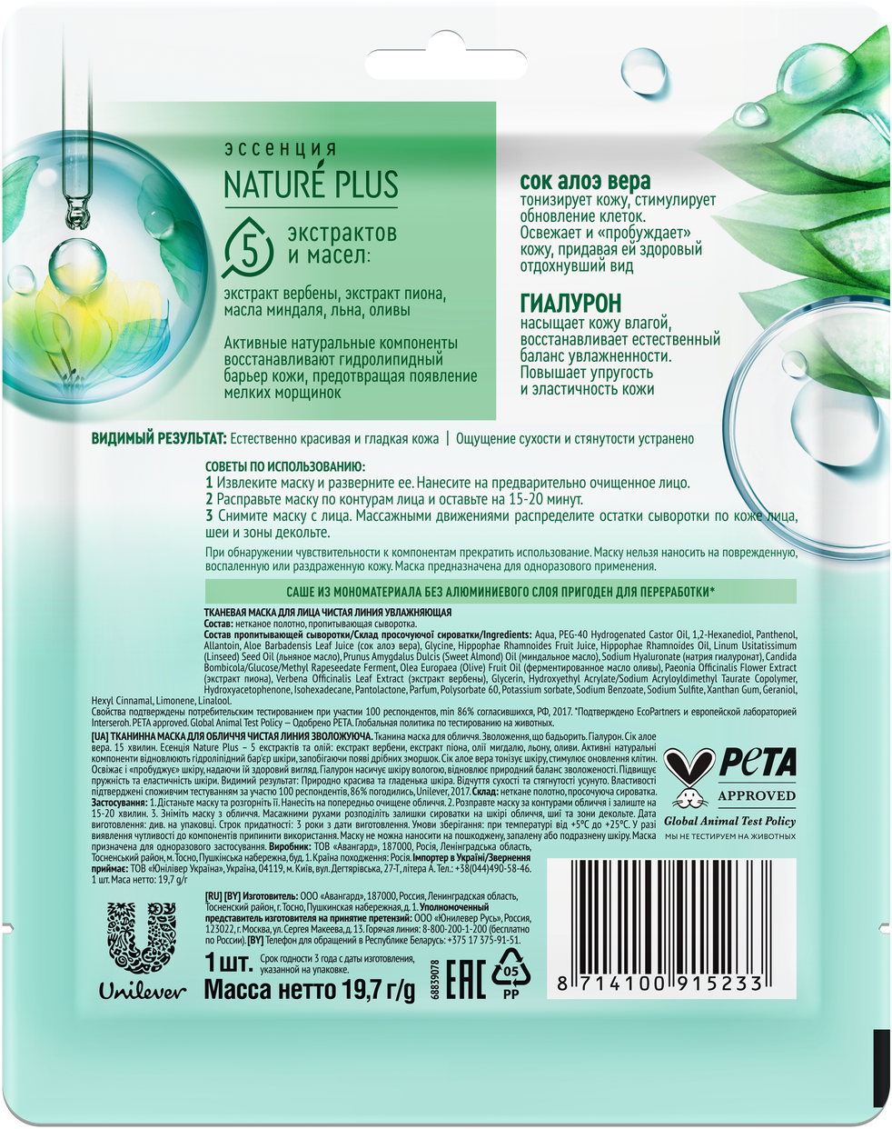 | Особенности | увлажнение, смягчение, питание, тонизирует |