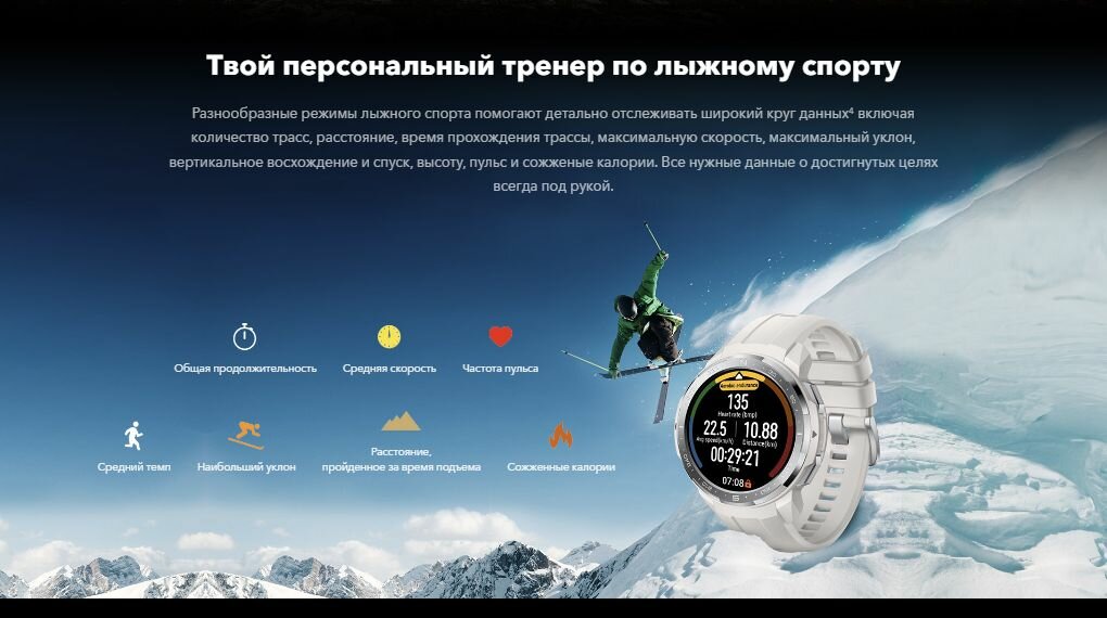 Разнообразные режимы лыжного спорта помогают детально отслеживать широкий спектр данных, включая количество трасс, расстояние, время прохождения трассы, максимальную скорость, максимальную крутизну склона, вертикальное восхождение и спуск, высоту, ваш пульс и сожженные калории. В вашем распоряжении всегда будут точные данные о достигнутых целях.