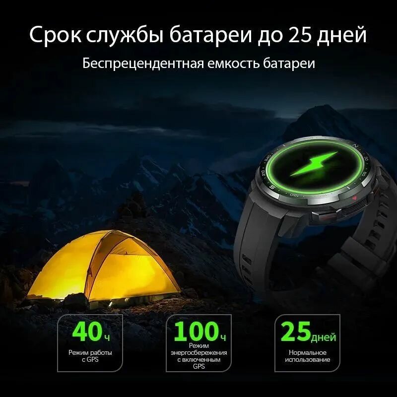 Часы HONOR Watch GS Pro могут выдержать без зарядки до 25 дней. Даже при включенном GPS-режиме они могут работать без зарядки до 100 часов. Теперь любители приключений могут исследовать дикую природу, не беспокоясь об уровне заряда батареи.