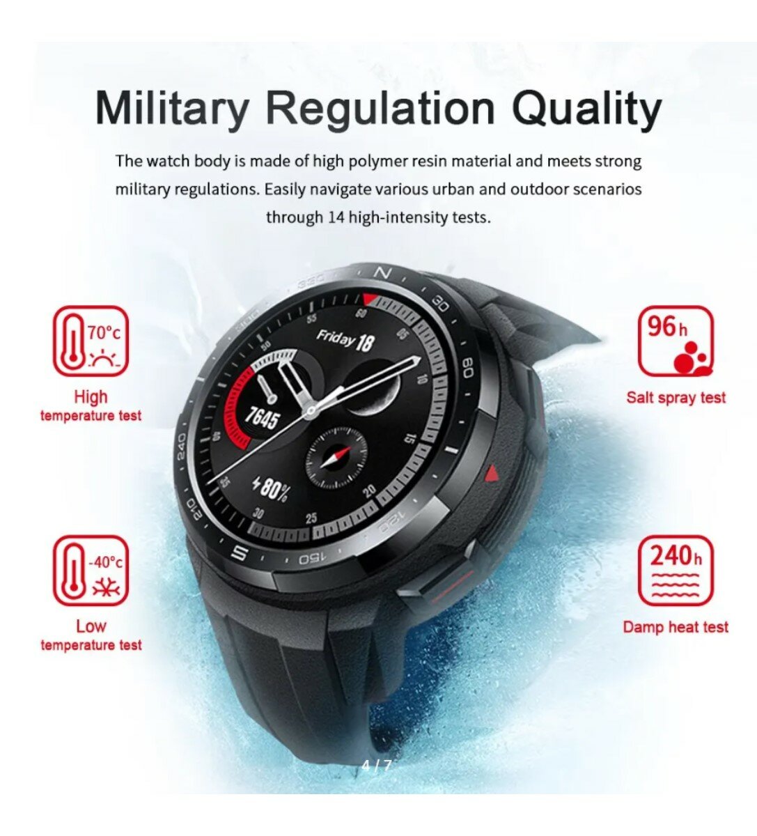 Часы HONOR Watch GS Pro прошли 14 различных тестов MIL-STD-810G, включая тест на сопротивление высоким и низким температурам, влажности и изменению высоты над уровнем моря, сопротивление повышенной влажности, что говорит о том, что часы могут выдерживать экстремальные условия.