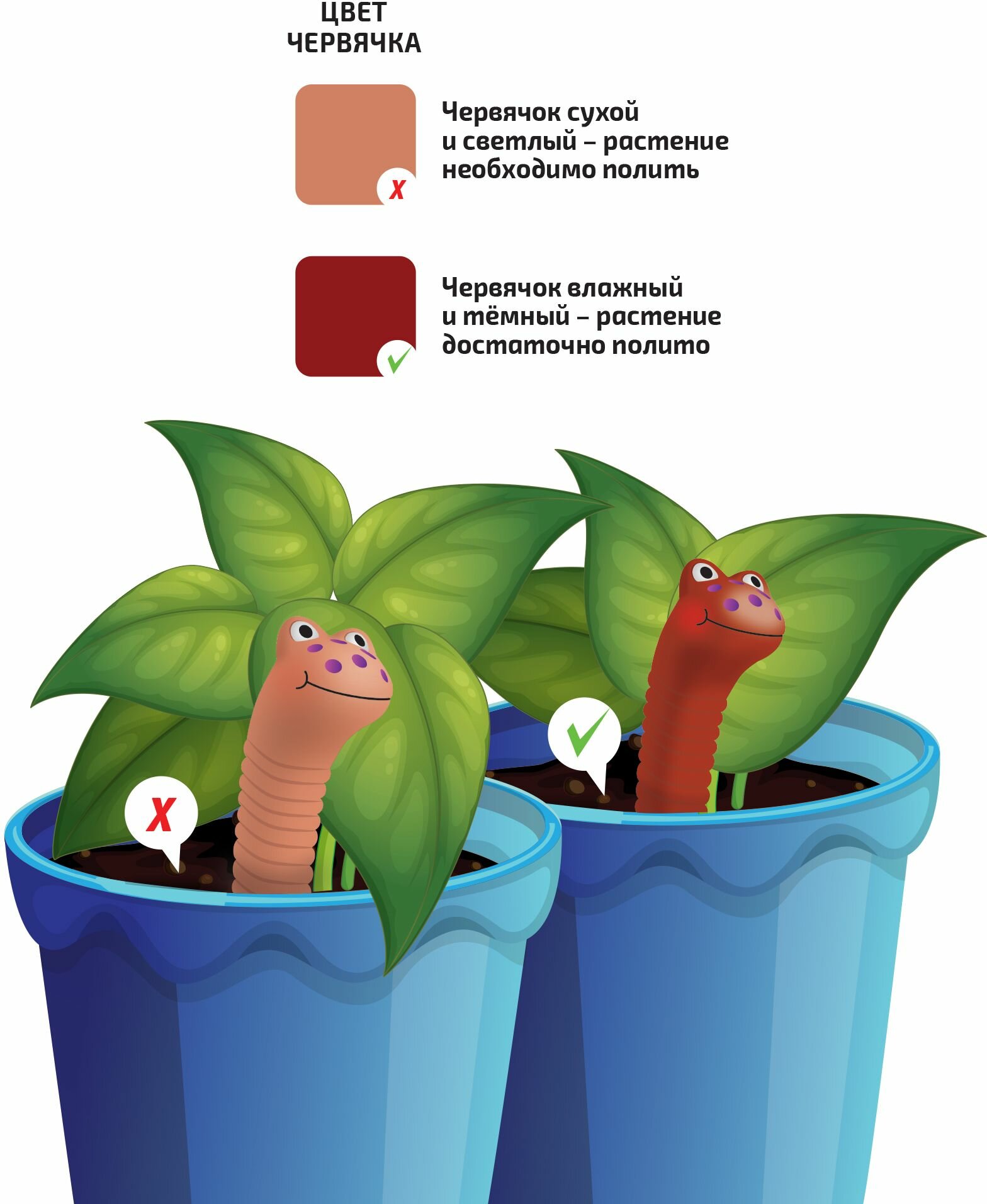 | Применение продукта | Как только почва начинает высыхать, червячок меняет оттенок на более светлый, давая понять, что пришло время полива. |