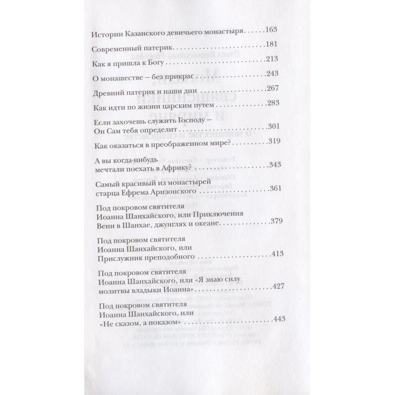 Прочитав эту книгу, вы побываете в благодатной Оптиной пустыни и в древнем киевском Зверинецком монастыре, в тихих калужских обителях и в прекрасном монастыре Ефрема Аризонского «Живоносный Источник», в живописных предгорьях Сьерра-Невады, в гостях у святителя Нектария Эгинского на маленьком греческом острове Эгина, у святителя Иоанна Шанхайского на Тубабао и в Сан-Франциско, у митрополита Лавра и архиепископа Аверкия (Таушева) в знаменитом Джорданвилле и в уникальном Ново-Дивеево.