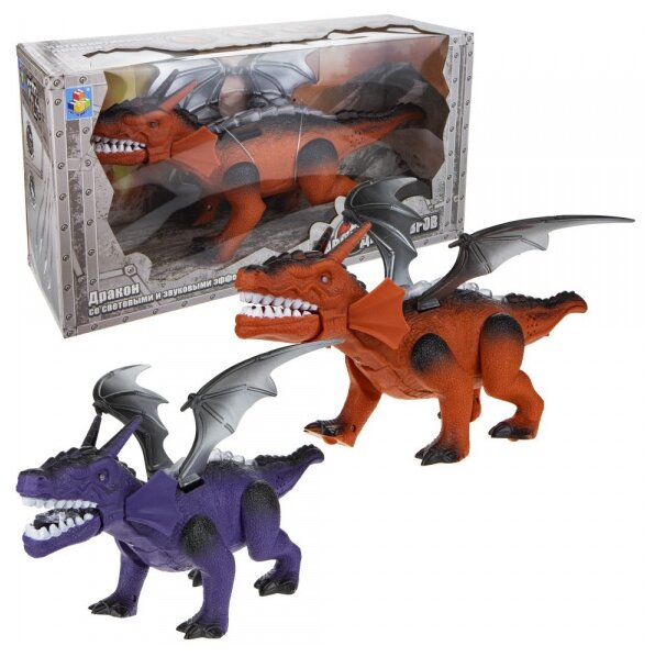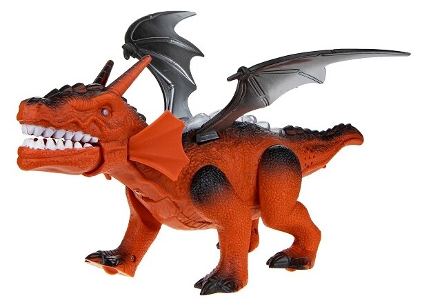 Интерактивный рободинозавр с реалистичной внешностью и множеством интересных функций. Динозавр с зубастой пастью, длинным туловищем и коротким хвостом, четырьмя лапами. На голове два рога, на спине подвижные крылья. Управляется с помощью дистанционного пульта. Умеет двигаться и махать крыльями, открывать и закрывать пасть, рычать. Во время движения активируются световые эффекты (светятся глаза, гребень, пасть), издаются рычащие звуки. Игрушка представлена в 2-х вариантах – оранжевый, фиолетовый.