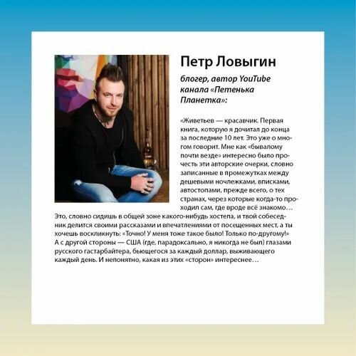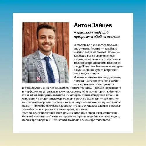 Прочитала книгу за 3 дня - она очень легкая, динамичная и здорово погружает в атмосферу! Читая главы, сам как будто участвуешь в описываемых событиях - гуляешь по пыльным улицам Индии, шумным клубам и барам Бразилии, болтаешь с туристами в Америке. Автору удалось собрать воедино свои путевые заметки, ловко передав буквально парой слов менталитеты местных жителей. Закрываешь книгу со словами: Как же скучно я живу! :)) Ждем продолжения!