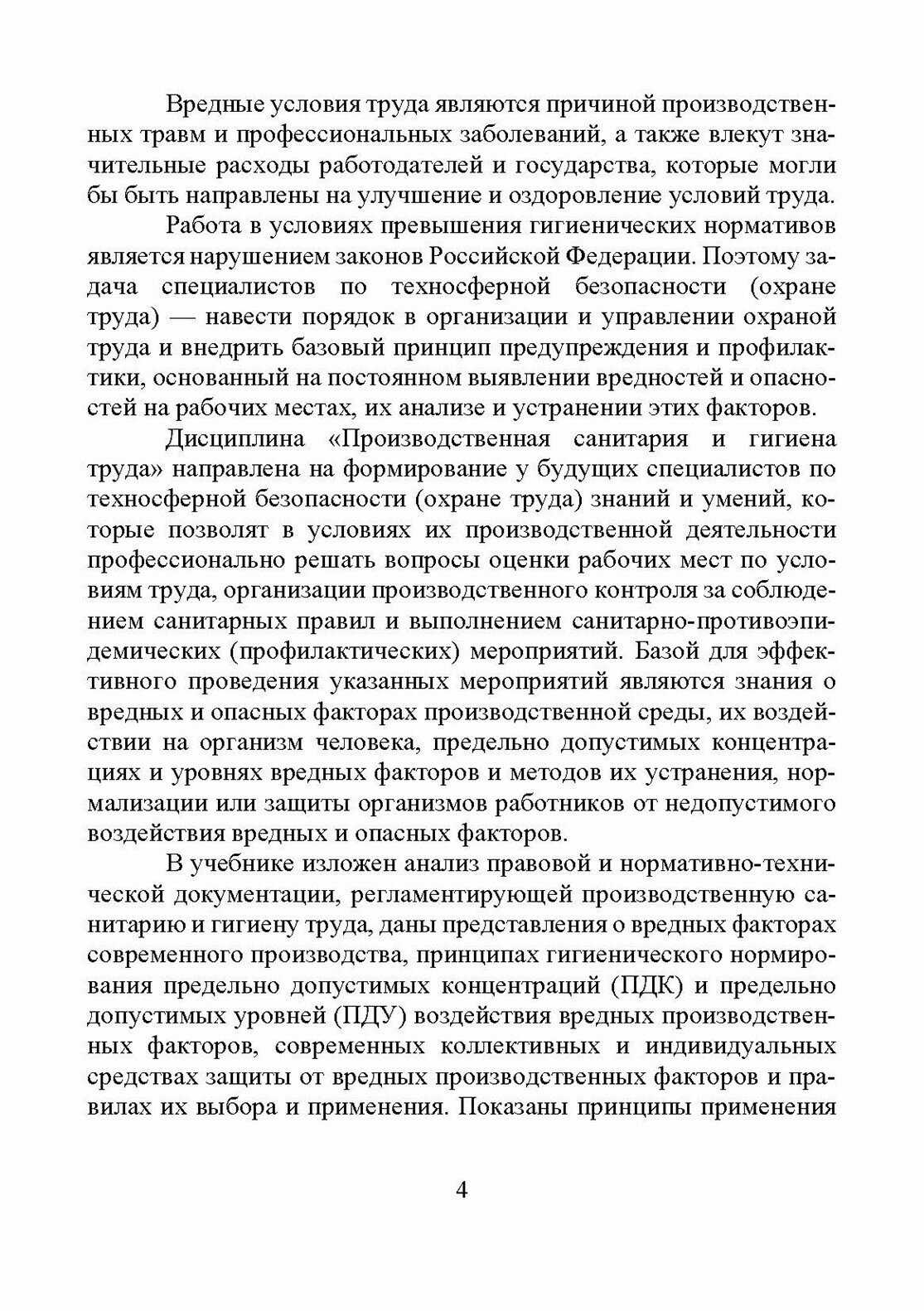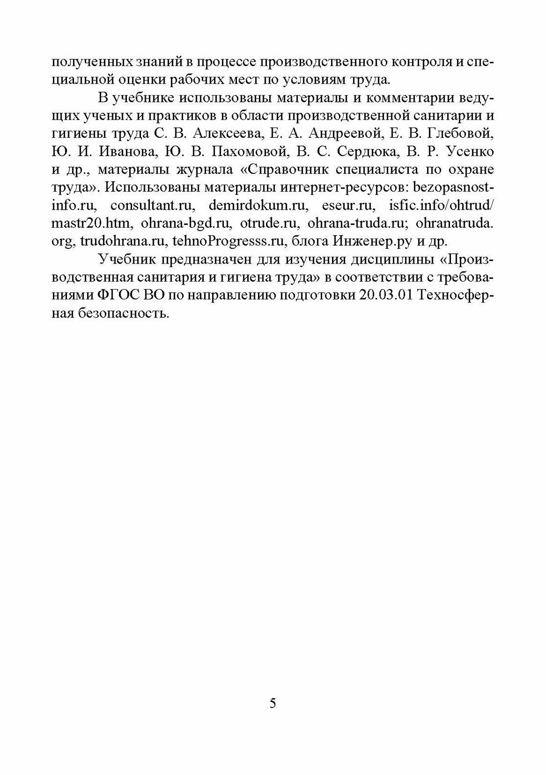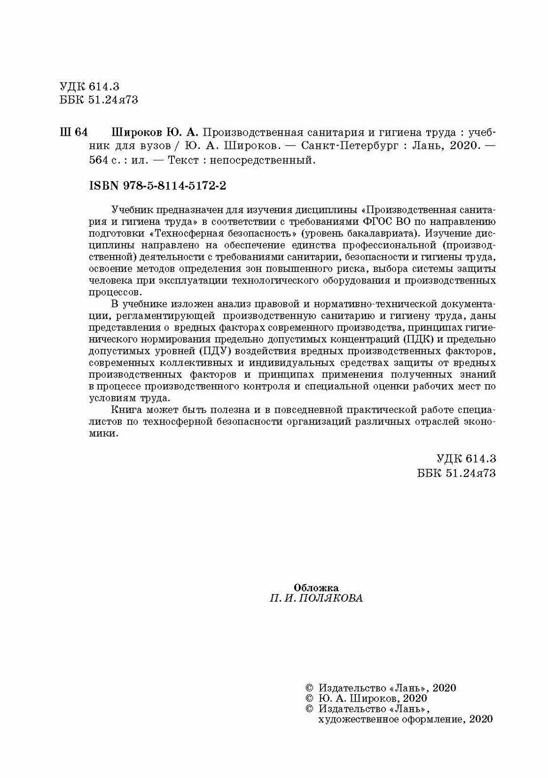Учебник предназначен для изучения дисциплины «Производственная санита-рия и гигиена труда» в соответствии с требованиями ФГОС ВО по направлению подготовки «Техносферная безопасность» (уровень бакалавриата). Изучение дис-циплины направлено на обеспечение единства профессиональной (производ-ственной) деятельности с требованиями санитарии, безопасности и гигиены труда, освоение методов определения зон повышенного риска, выбора системы защиты человека при эксплуатации технологического оборудования и производственных процессов.
