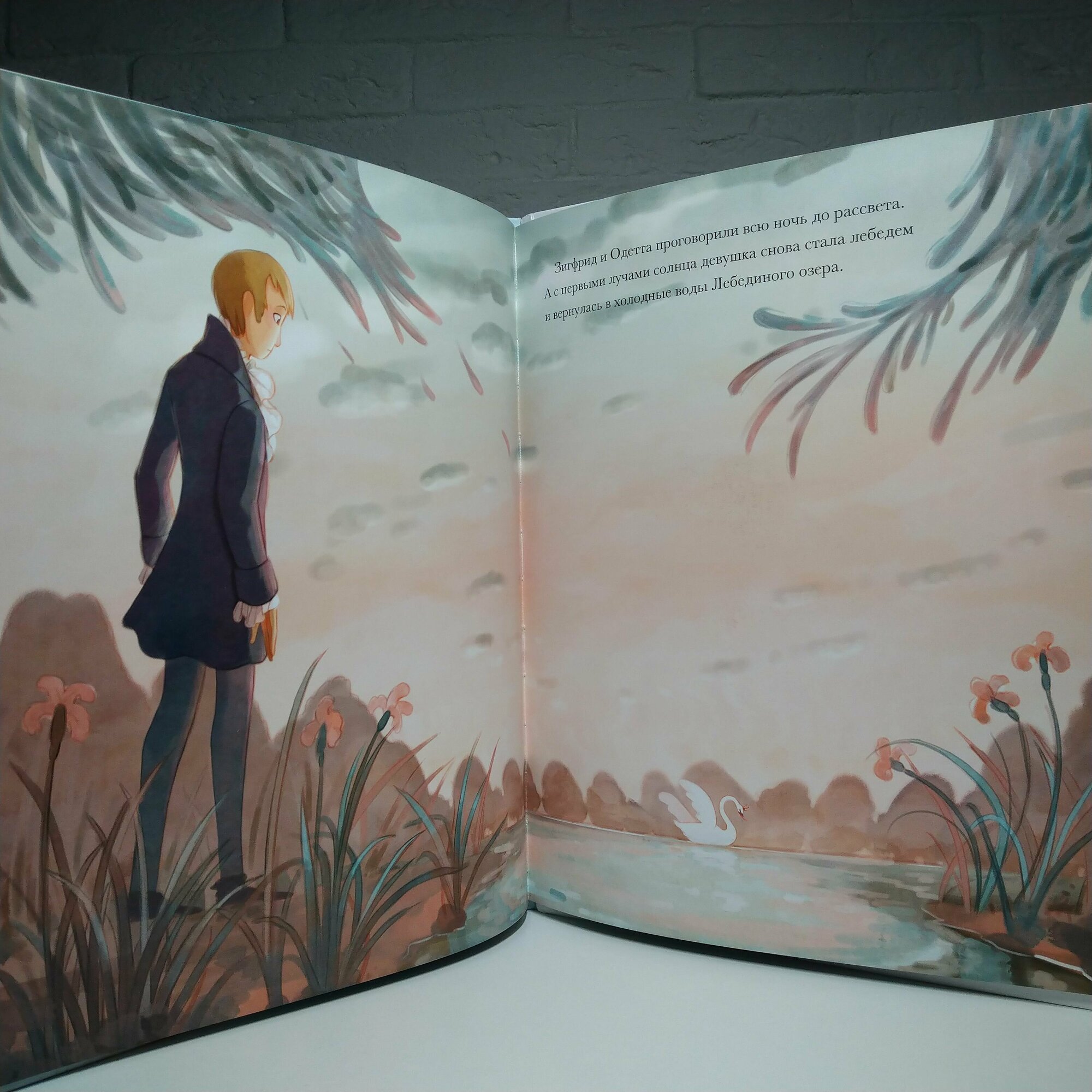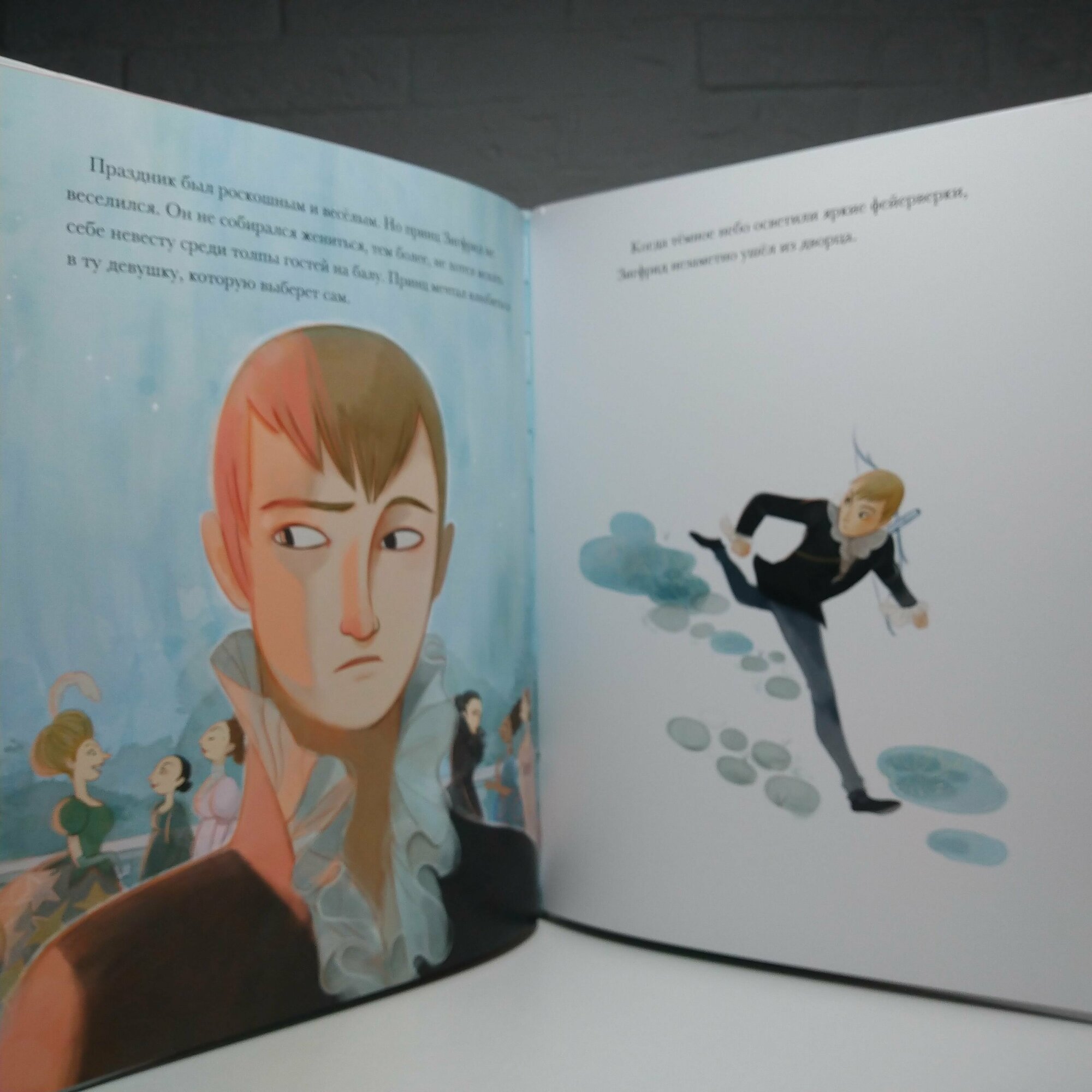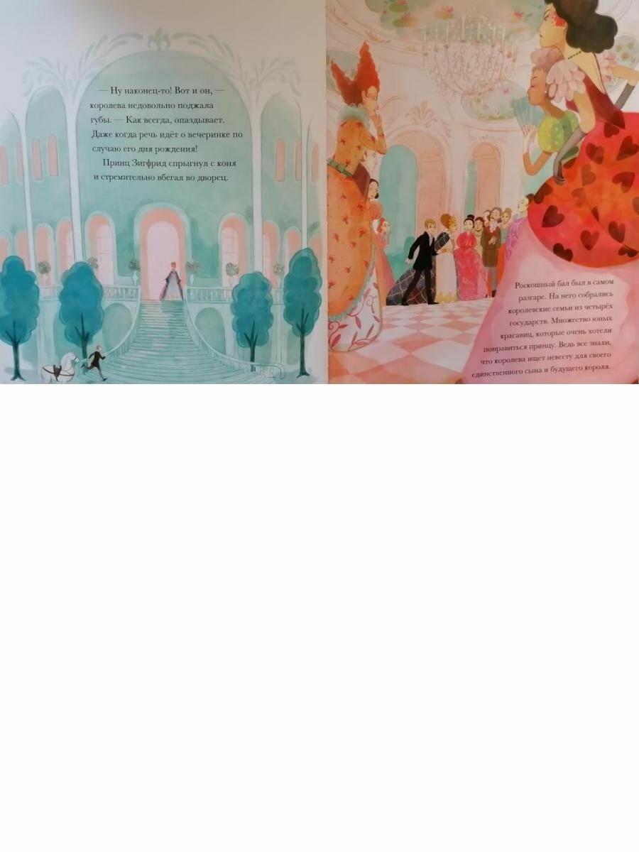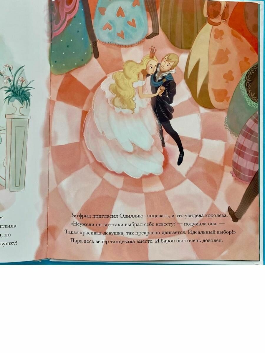 Формат приблизительно А4. Очень плотная меловка. Блок проклеен. Буква "Ё" есть. Форзац и нахзац голубого цвета без иллюстраций. Решила разместить несколько начальных разворотов (самые первые два уже размещены сайтом) и несколько последних. Дело в том, что изначально либретто "Лебединого озера" имело плохой конец, Одетта и принц погибали, хотя чары Ротбарта разрушались, так что остальные лебеди снова становились девушками. В России большинство постановок "Лебединого озера" все же заканчиваются хорошо, но в других странах финал чаще грустный. Здесь вроде не говорится, что это либретто, хотя это "классические истории". Словом, сами читайте последние развороты, где сказано, что принц догнал Одетту в глубоких водах Лебединого озера. Они обнялись и навеки остались вместе. А потом уже определяйтесь. Видимо автор перевода пытался как-то и от канонического финала не отходить, и слишком деток не огорчать :).
