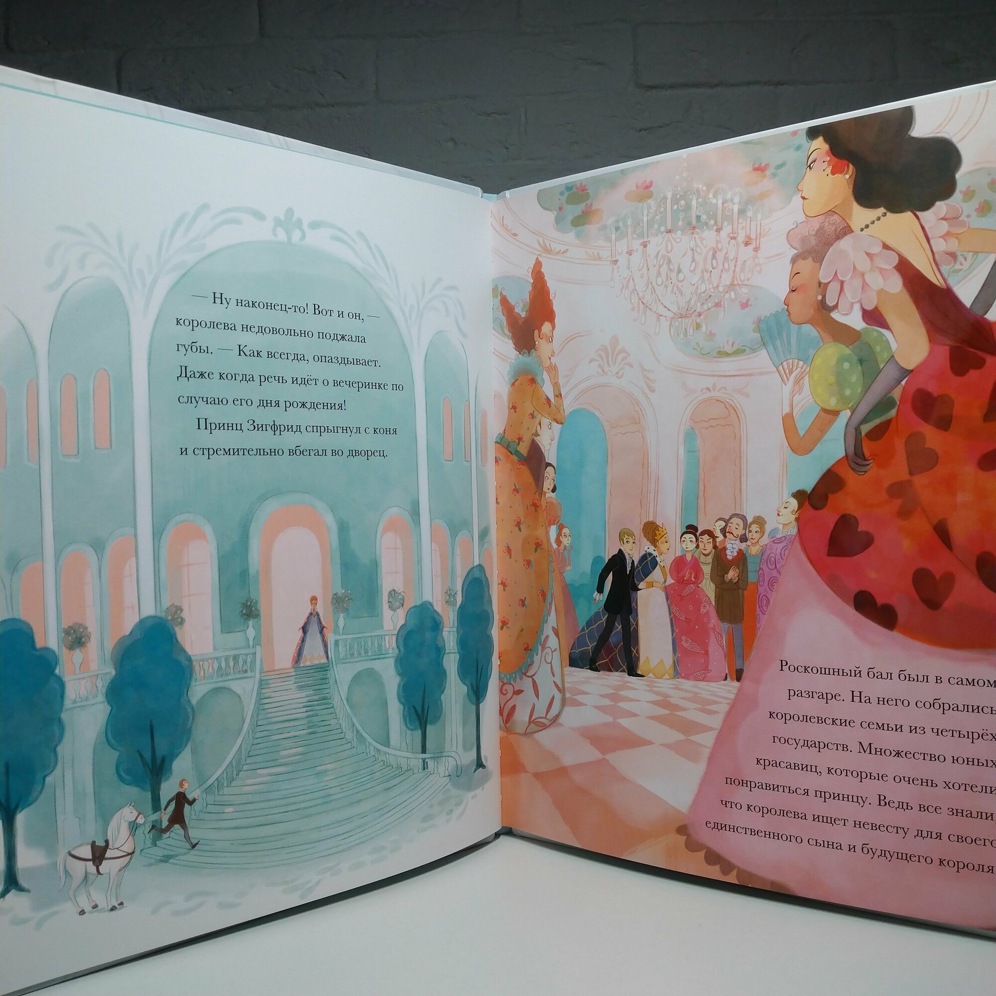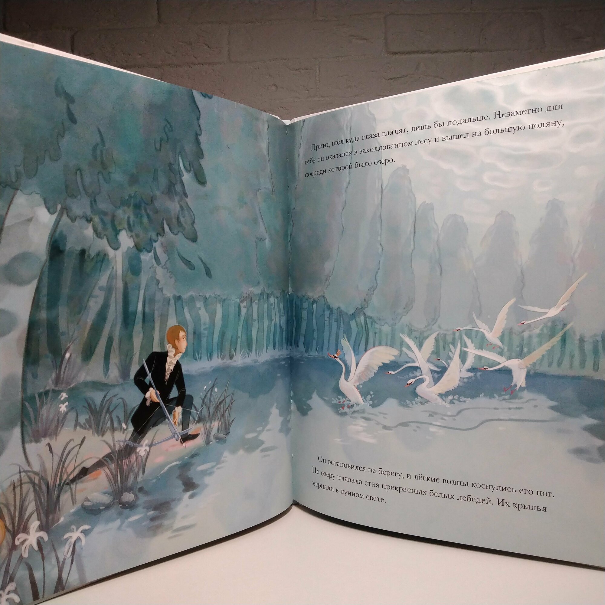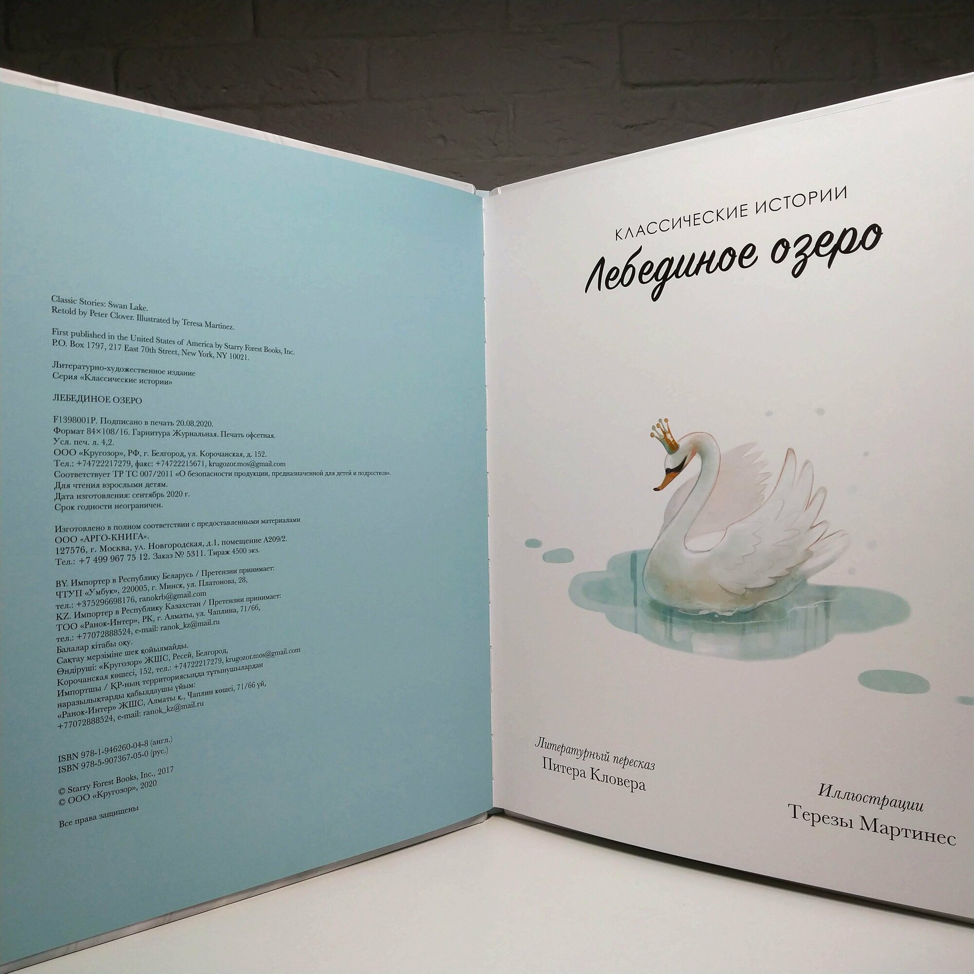 Формат приблизительно А4. Очень плотная меловка. Блок проклеен. Буква "Ё" есть. Форзац и нахзац голубого цвета без иллюстраций. Решила разместить несколько начальных разворотов (самые первые два уже размещены сайтом) и несколько последних. Дело в том, что изначально либретто "Лебединого озера" имело плохой конец, Одетта и принц погибали, хотя чары Ротбарта разрушались, так что остальные лебеди снова становились девушками. В России большинство постановок "Лебединого озера" все же заканчиваются хорошо, но в других странах финал чаще грустный. Здесь вроде не говорится, что это либретто, хотя это "классические истории". Словом, сами читайте последние развороты, где сказано, что принц догнал Одетту в глубоких водах Лебединого озера. Они обнялись и навеки остались вместе. А потом уже определяйтесь. Видимо автор перевода пытался как-то и от канонического финала не отходить, и слишком деток не огорчать :).