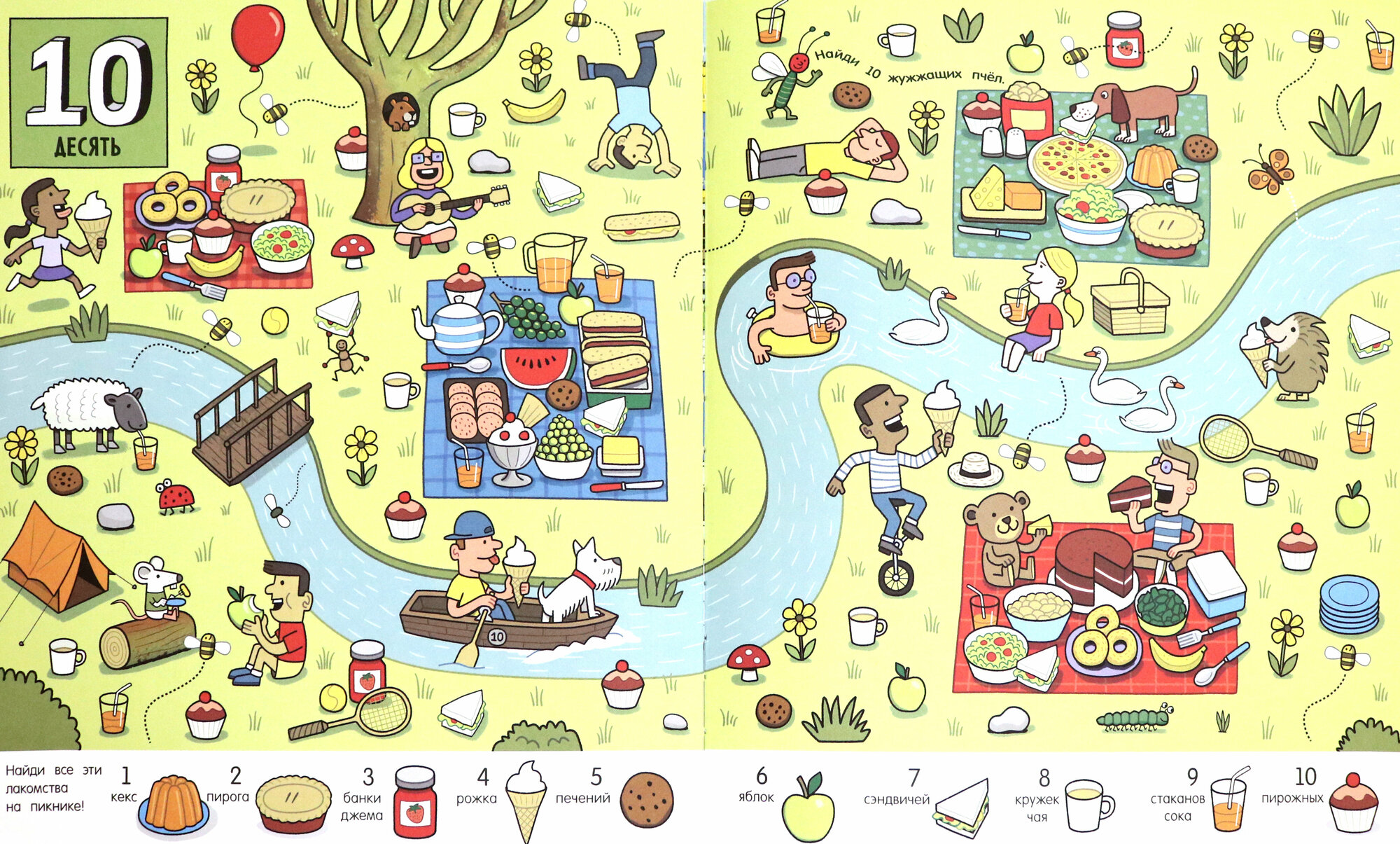 Искать будет проще, если начинать с верхнего левого угла страницы и постепенно двигаться вправо и вниз, стараясь ничего не пропустить. Лист бумаги и карандаш пригодятся, чтобы записывать, сколько предметов ты уже отыскал.