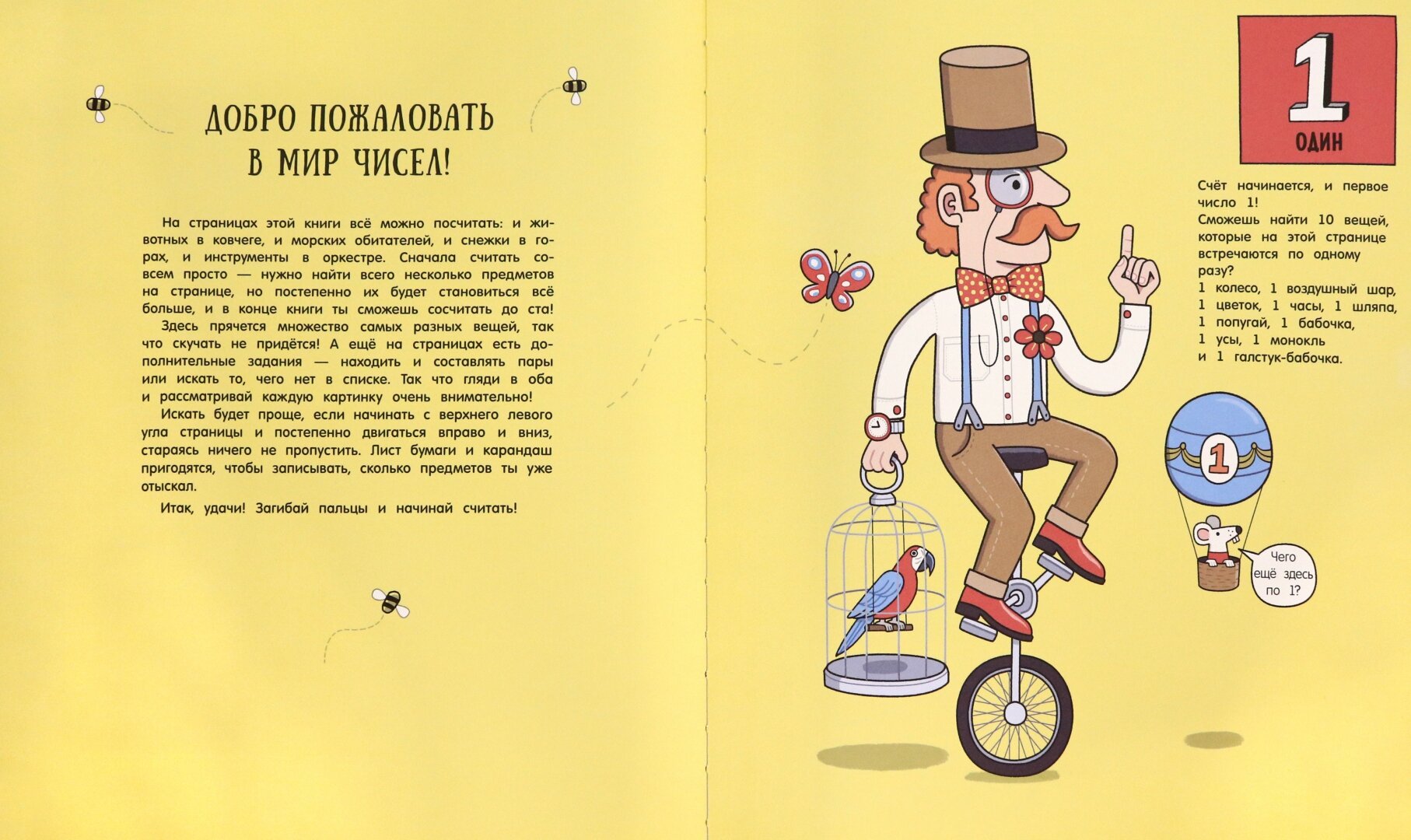 На страницах этой книги всё можно посчитать: и животных в ковчеге, и морских обитателей, и снежки в горах, и инструменты в оркестре. Сначала считать совсем просто - нужно найти всего несколько предметов на странице, но постепенно их будет становиться всё больше, и в конце книги ты сможешь сосчитать до ста!