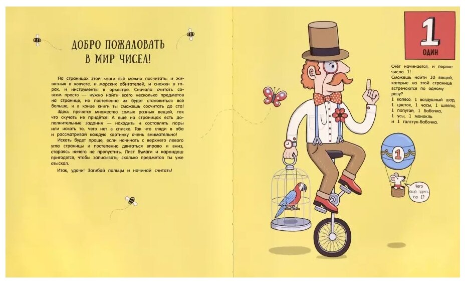 Итак, на каждой странице нужно сосчитать множество разных вещей. Книга построена от простого и легкого до серьeзных испытаний в королевском замке, на острове сокровищ, на пикнике, в Восточном экспрессе, внутри робота, в оркестре, на стройке многоэтажного дома и не только. Ребенок не просто научится считать, но и логически мыслить, узнает множество новых вещей из разных сфер жизни и их названия, пополнит словарный запас и кругозор. Книгой увлеченно заинтересовались и более младшие и старшие дети. И мы - родители, приобрели вместе с ней приятное дружное времяпрепровождение и просто эстетическое удовольствие от рисунков, качества бумаги и всей этой задумки. -