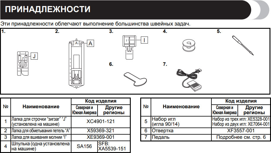 | Комплект поставки | инструкция по эксплуатации; лапка для вшивания молнии; лапка для зигзага; набор игл; отвертка; педаль; приставной столик; шпули |