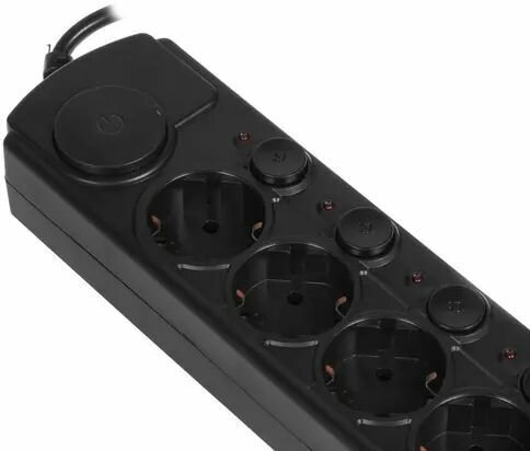 - Большие кнопки включения и выключения розеток. Индикация яркая. Розетки дают хороший контакт с вилками и у меня не болтаются, ни зарядки от телефоном ни монитор. Сетевой кабель толстый и длинный, 5 метров.