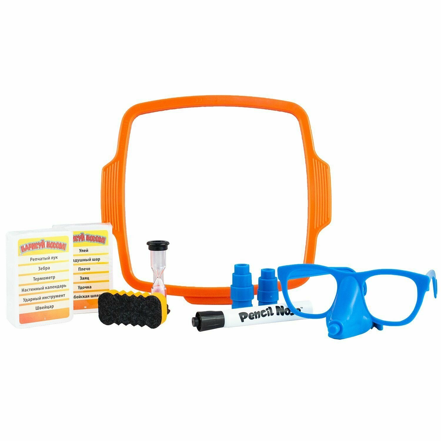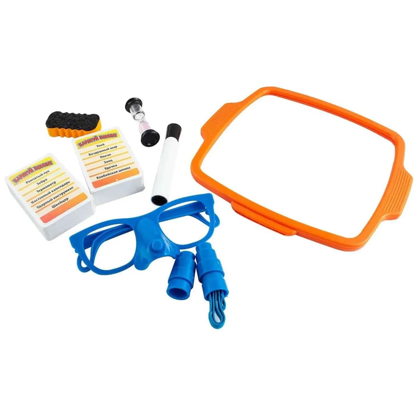 | Комплектация | 1 доска для рисования, 1 маркер, 1 пара очков, 1 губка, 110 карточек, 1 песочные часы, правила игры |