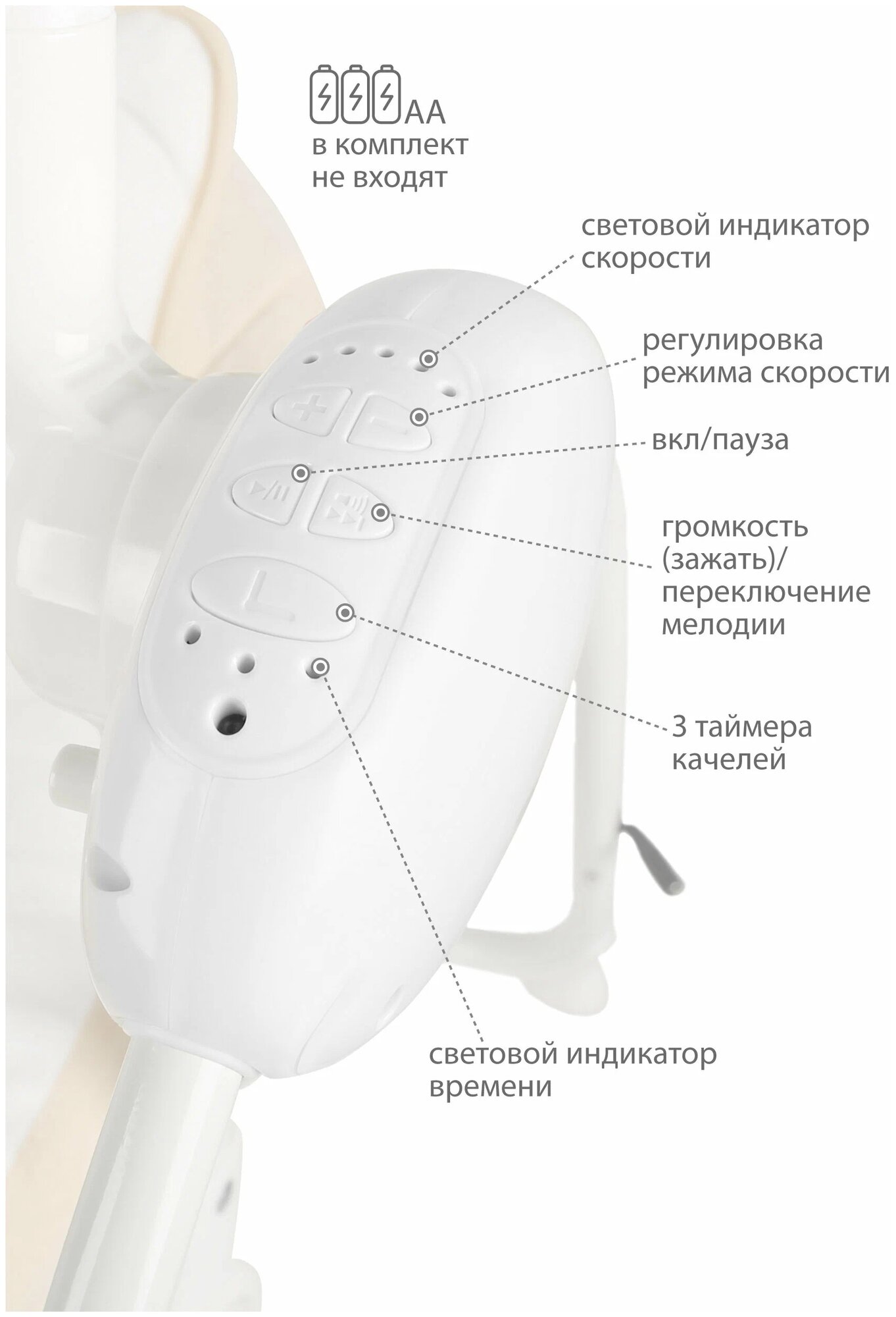 | Комплектация | электокачели, москитная сетка, пульт, адаптер питания, мобиль с игрушками |
