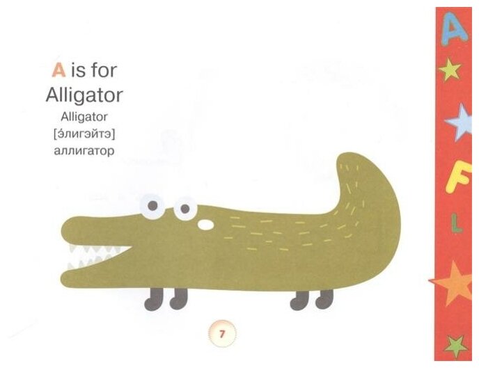 Данный альбом достался мне очень дёшево, всего за 69 рублей с учётом бонусных баллов и участия книги в распродаже. Купила для 4-летнего ребёнка, интересующегося изучением английского языка. Альбом не плохой с учётом возрастной категории. Рисунки примитивные, некоторые персонажи даже взрослому человеку тяжело разгадать в этом стиле рисования. Это минус альбома. На одну букву как правило выделен один разворот: на левой страничке буква и описание её звучания, на правой страничке крупный рисунок на белом фоне с одним словом на эту букву. Название буквы нигде не указывается, сразу даётся описание звука. Например Н произносится как [Х], но нет названия буквы - [эйч]. Дана схема написания печатной буквы с указанием направлений письма стрелочками. Транскрипция – ну так себе, например: Lion – [лайэн], Xylophone – [зайлэфэун]