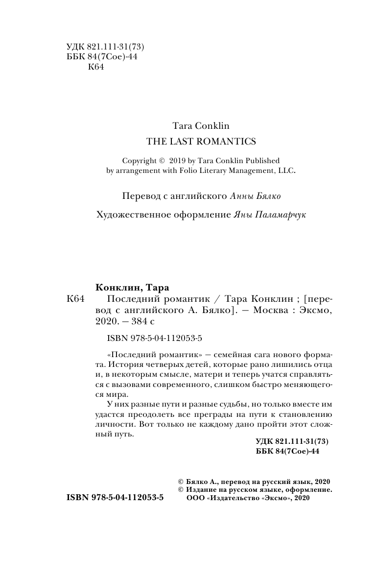 У «Последнего романтика» удивительная атмосфера. Это книга о всех возможных проявлениях эмоций и любви, ведь в центре повествования оказываются судьбы четырех братьев и сестер. Это ода человеческим (и человечным) взаимоотношениям, непредсказуемости судьбы и приятной горечи воспоминаний. Трудно вписать роман Тары Конклин в рамки одного жанра, и от этого он лишь прекраснее. Умное и тонкое произведение. Как ответственный редактор книги, скажу, что мне было очень приятно работать с этой книгой.