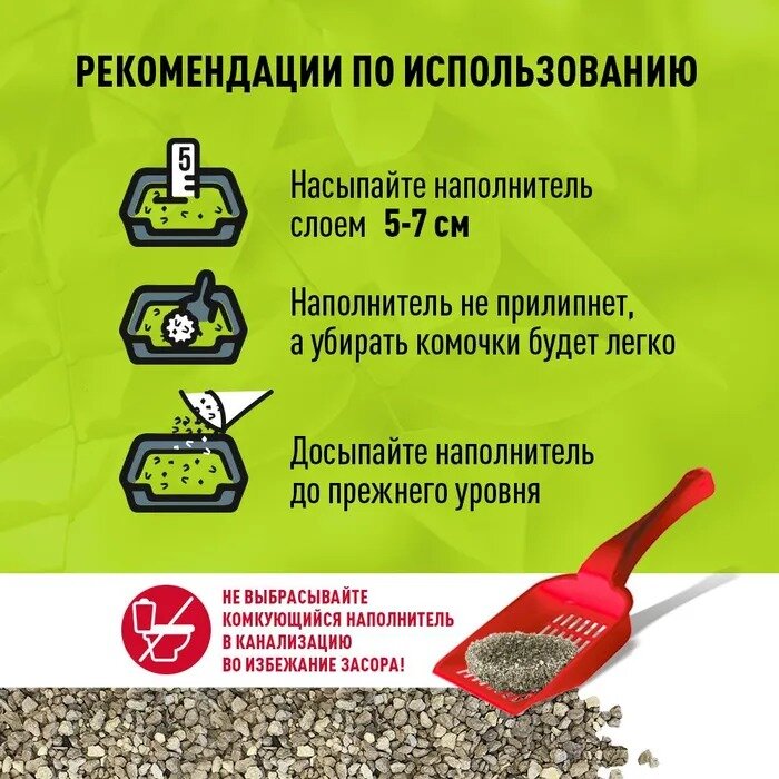 Рекомендации: подберите оптимальный по размеру лоток для Вашего питомца. Рекомендуем лоток с высокими бортиками. Насыпьте в лоток слой наполнителя не менее 5 см. Обязательно следите за поддержанием такого уровня в лотке. Следите за чистотой лотка и регулярно убирайте комочки и твердые отходы специальным совочком в мусорный пакет. Досыпайте наполнитель до прежнего уровня. При меньшем слое наполнитель будет работать неэффективно. Периодически проводите дезинфекцию лотка.