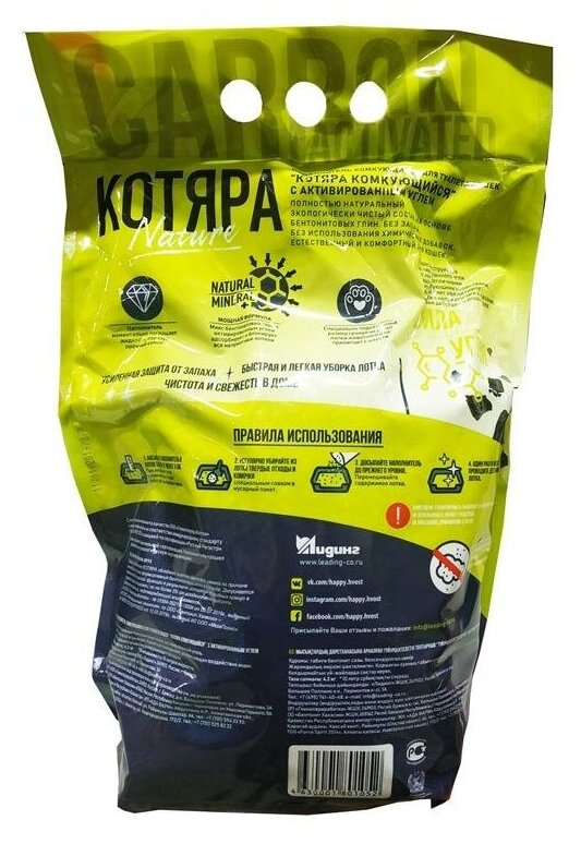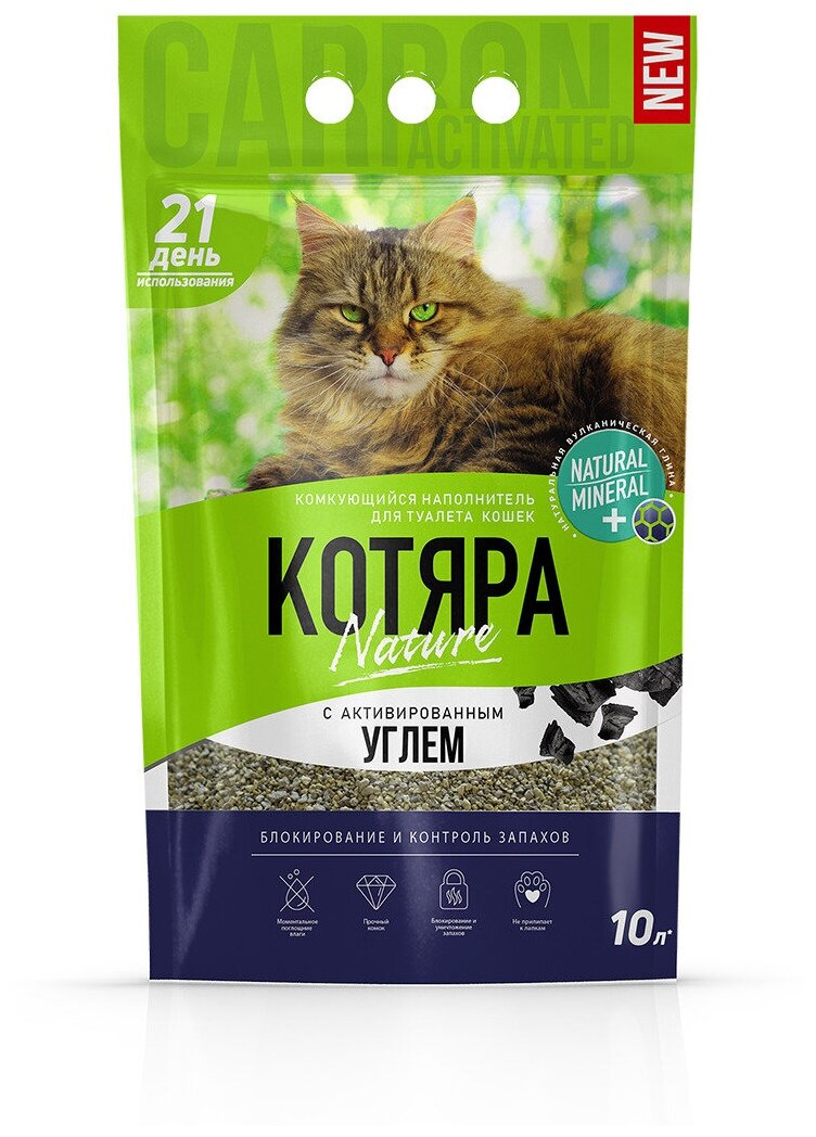 Комкующийся наполнитель Котяра с активированным углем обладает отличными адсорбирующими свойствами. Благодаря пористой структуре активированного угля эффективно борется с неприятными запахами, усиливая действие бентонитовых глин. Специально подобранный размер гранул, не ранит лапки животного и не прилипает к шерсти. Мощная формула Natural Mineral + с активированным углем адсорбирует и моментально блокирует все неприятные запахи. До 21 дня использования одной упаковки!