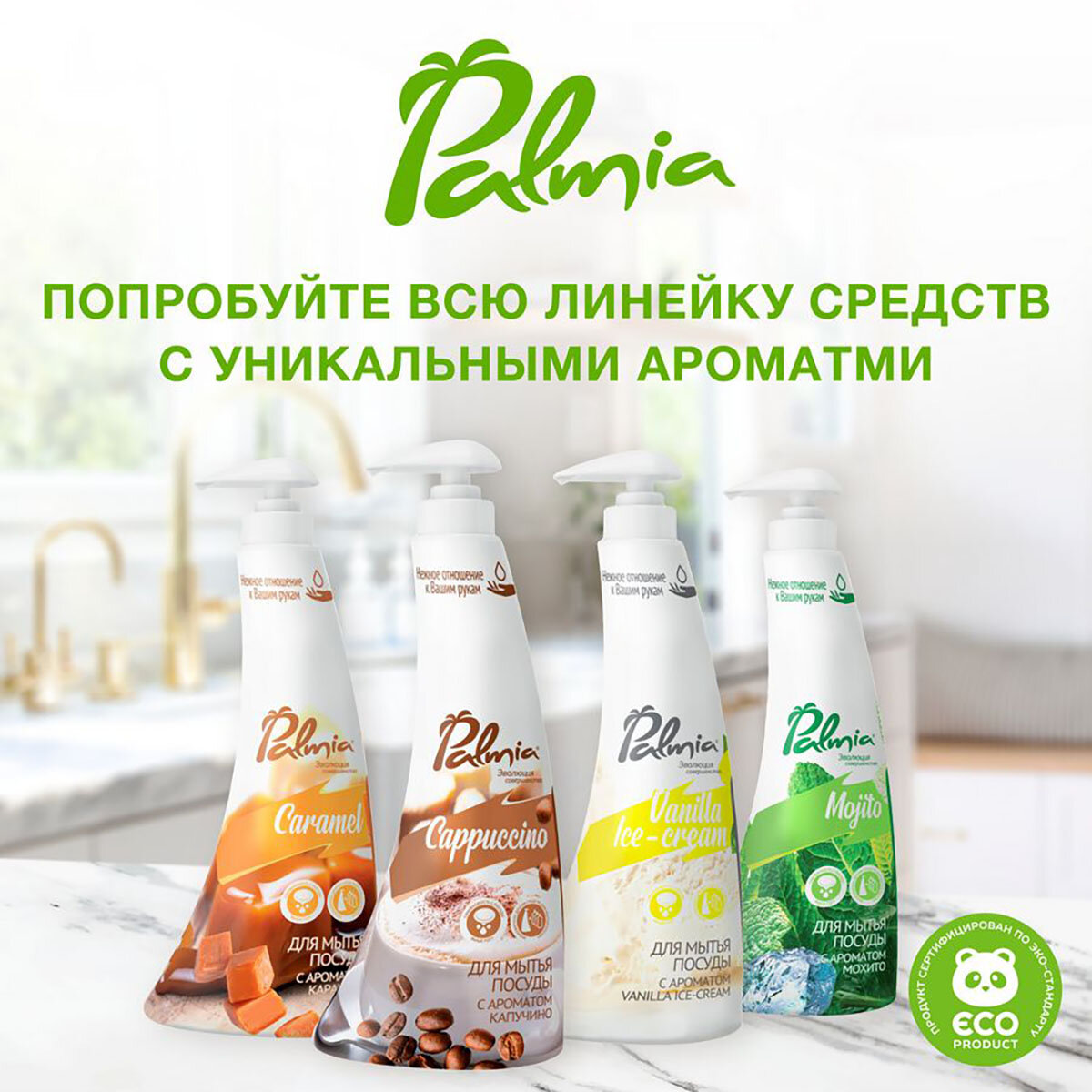Palmia Mojito Palmia Mojito – гипоаллергенное средство для мытья посуды с ароматом мохито от New Chemical Technologies.Свежий аромат мохито подарит заряд бодрости и позволит окунуться в атмосферу теплых летних дней! Продукт сертифицирован по ЭКО – стандарту РФ Безопасен для детей и взрослых Премиальное качество в экономичной упаковке Использование в производстве только высококачественного сырья Не раздражает кожу рук, низкий уровень PH~5,3 Смывает любые загрязнения и трудновыводимые запахи (например, запах рыбы) Хорошее пенообразование В 9 раз превышает стандарты по смываемости с посуды Суперсмываемость позволяет экономить воду Эффективно в холодной и жесткой воде Свежий аромат мохито Безопасно для септиков