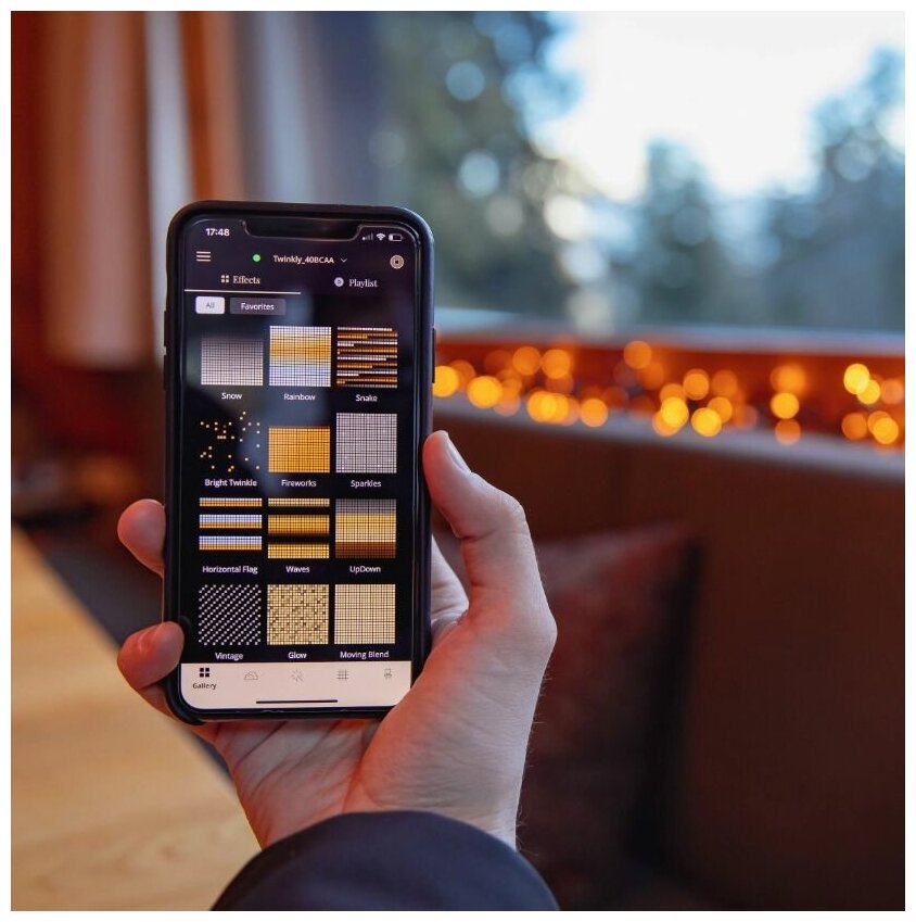 Twinkly - особо эффектные премиум гирлянды, управляемые как кнопкой на гирлянде, так и из мобильного приложения Twinkly в них каждый светодиод управляется программой отдельно создавая великолепные эффекты. Twinkly предлагает набор эффектов и каждый из них можно в мобильном приложении легко и захватывающе модифицировать или создавать новые. Голосовое управления Google Assistant и Amazon Alexa (пока лишь на англ языке) разнообразит управление гирляндой. С помощью аксессуара Twinkly Music Dongle (приобретается отдельно) световые эффекты синхронизируются с музыкой. Разные гирлянды Тwinkly могут быть объединены программно в одну синхронно светящуюся группу (в группе должны быть гирлянды одного типа LED ламп, например, только RGBW). Гирлянды Twinkly разработаны как для внутреннего, так и для наружного (стандарту IP44) использования.