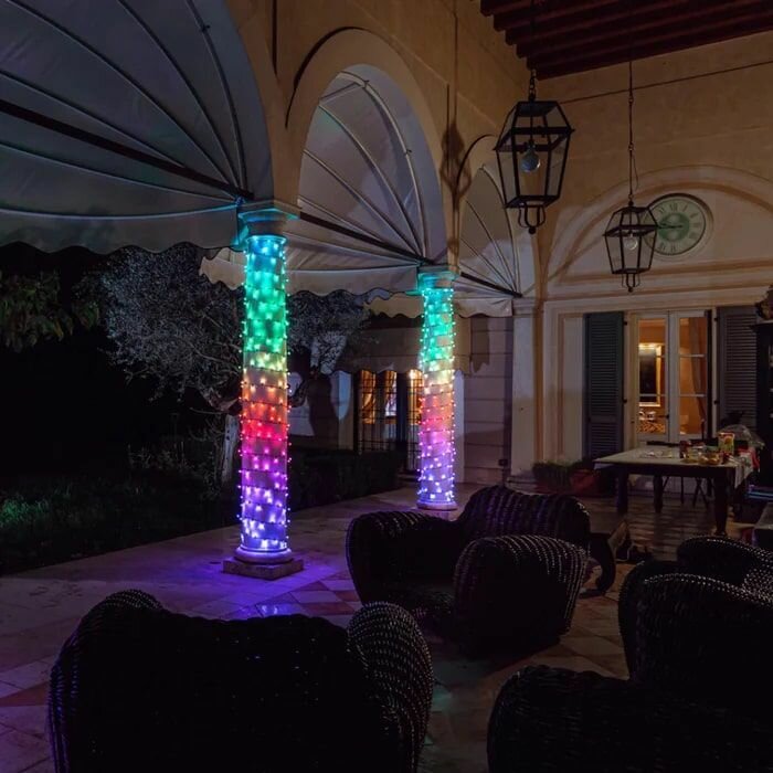 Серия Strings - одна из семейства разных типов гирлянд Twinkly, в ней LED лампочки расположены как на традиционных гирляндах, одна за одной, на расстоянии 8cм по длинной нити (strings). Наилучшим образом гирлянда Strings показывает себя при плотном обматывании объемных объектов или заполнении плоскостей, объемов, хотя годится и для акцентирования линий. Ее часто просто укладывают на снегу или траве хаотичным узором.