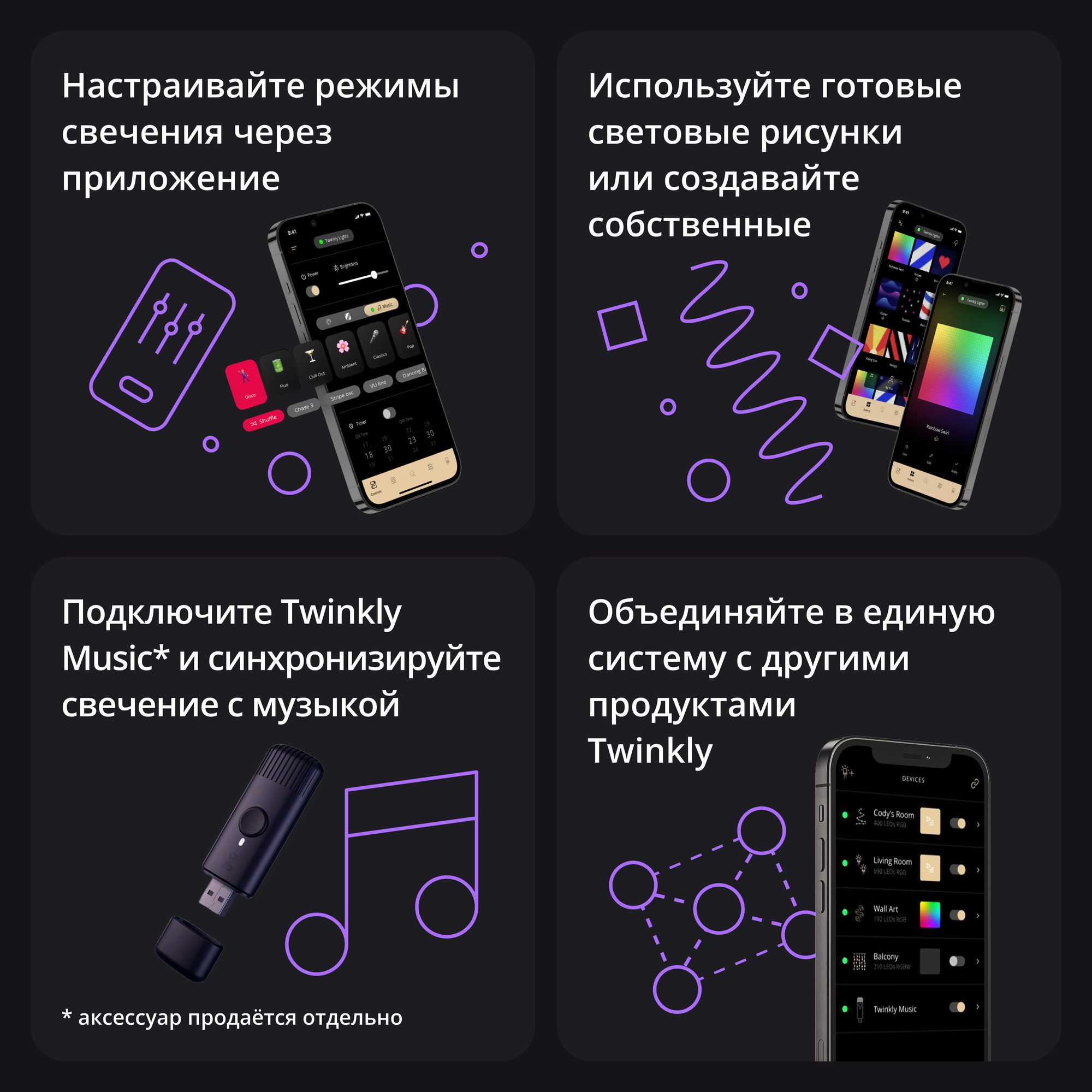Twinkly - особо эффектные премиум гирлянды, управляемые как кнопкой на гирлянде, так и из мобильного приложения Twinkly в них каждый светодиод управляется программой отдельно создавая великолепные эффекты. Twinkly предлагает набор эффектов и каждый из них можно в мобильном приложении легко и захватывающе модифицировать или создавать новые. Голосовое управления Google Assistant и Amazon Alexa (пока лишь на англ языке) разнообразит управление гирляндой. С помощью аксессуара Twinkly Music Dongle (приобретается отдельно) световые эффекты синхронизируются с музыкой. Разные гирлянды Тwinkly могут быть объединены программно в одну синхронно светящуюся управляемую группу (в группе должны быть гирлянды одного типа LED ламп, например, только RGBW). Гирлянды Twinkly разработаны как для внутреннего, так и для наружного (стандарту IP44) использования.