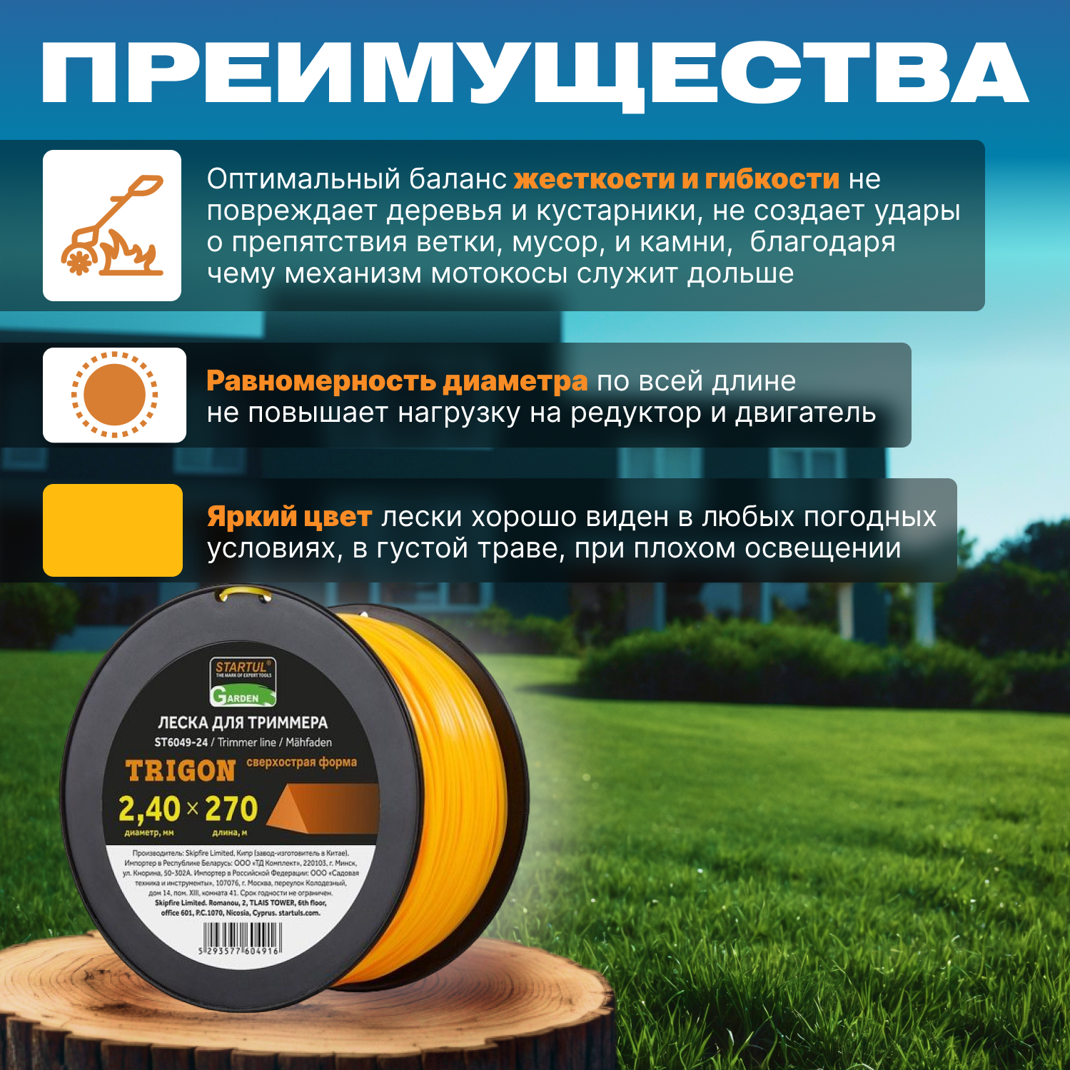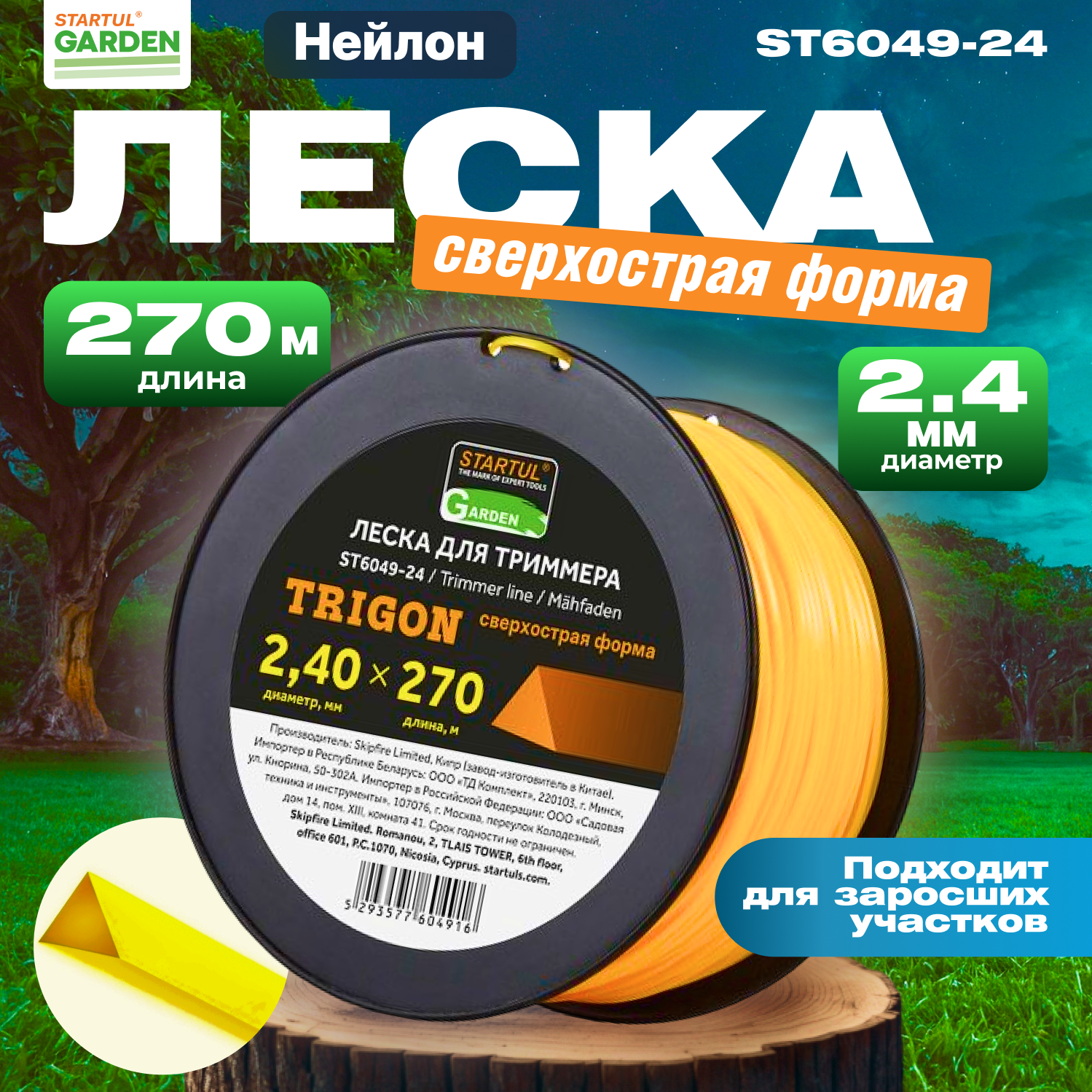 Описание лески STARTUL Garden 2.4 мм 270 м треугольник Леска используется на триммерах в качестве режущего инструмента триммера для травы, молодых побегов деревьев и кустов. Леска заправляется в специальную катушку, из которой подается в процессе работы вручную или автоматически.