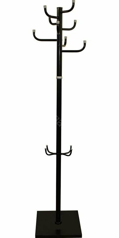 Вешалка напольная Мажор выполнена из оцинкованной стали с полименым покрытием, утяжеленной квадратное основание, 8 крючков для верхней одежды равномерно распределены по окружности стойки диаметром 38 мм. Поставляется в разобранном виде, в картонной таре.