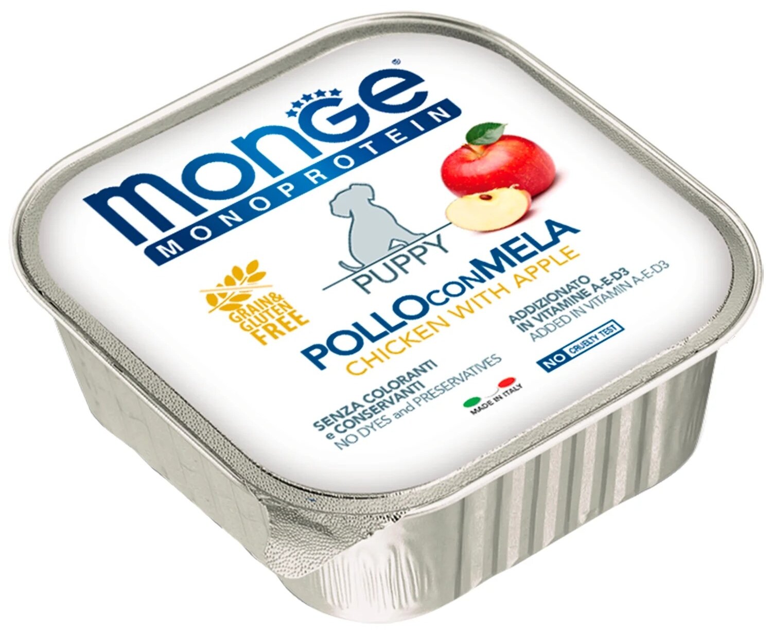Monge Dog Monoprotein Solo консервы для щенков паштет из мяса курицы. Полноценный рацион для щенков с 4-8 недельного возраста. Ароматный мясной паштет изготовлен из свежего мяса ципленка с добавлением косочков сочного яблока. При изготовлении в состав данного рациона входит только белок курицы и кусочки спелого яблока, Grain Free формула позволяют легко исключить из рациона ингредиенты, вызывающие аллергию.