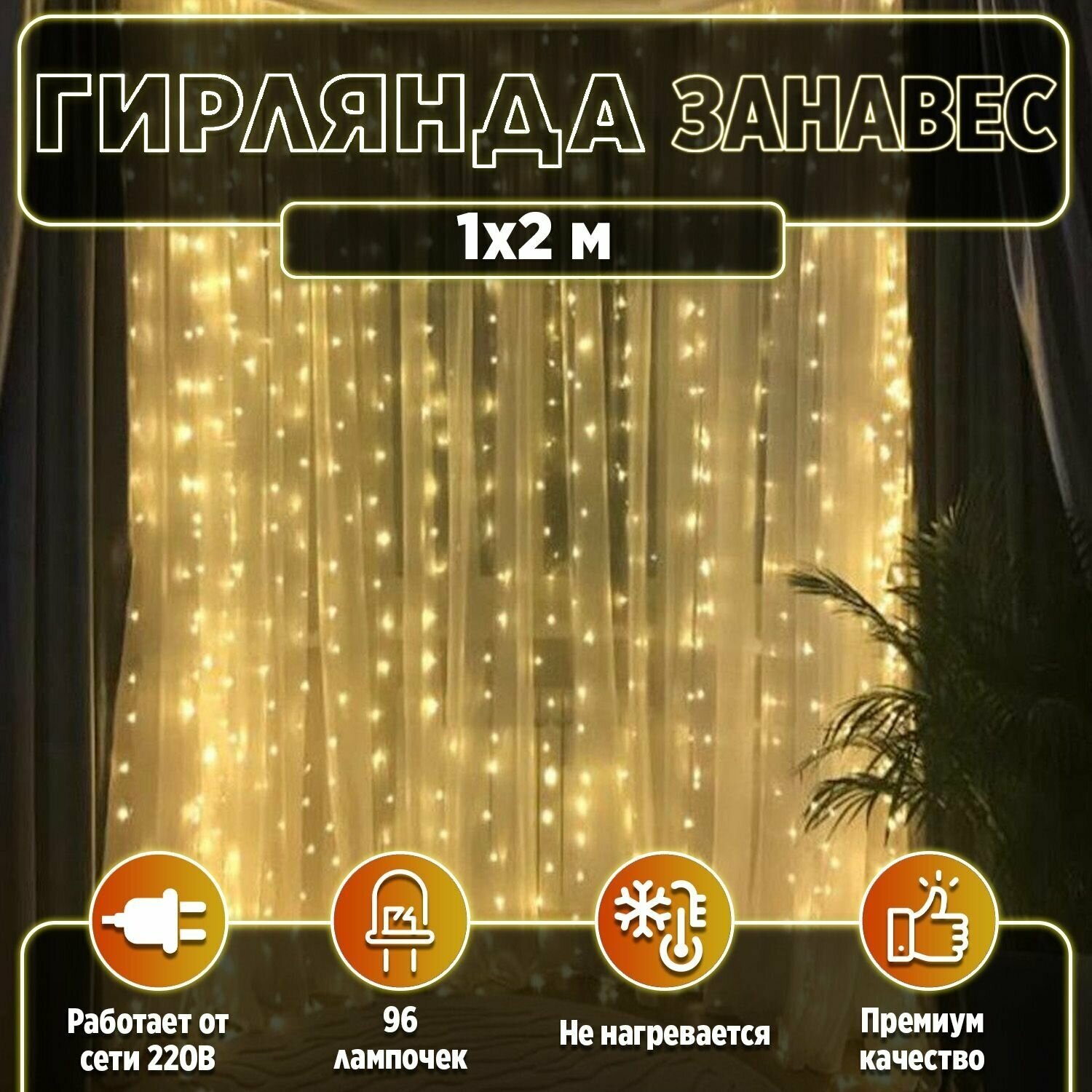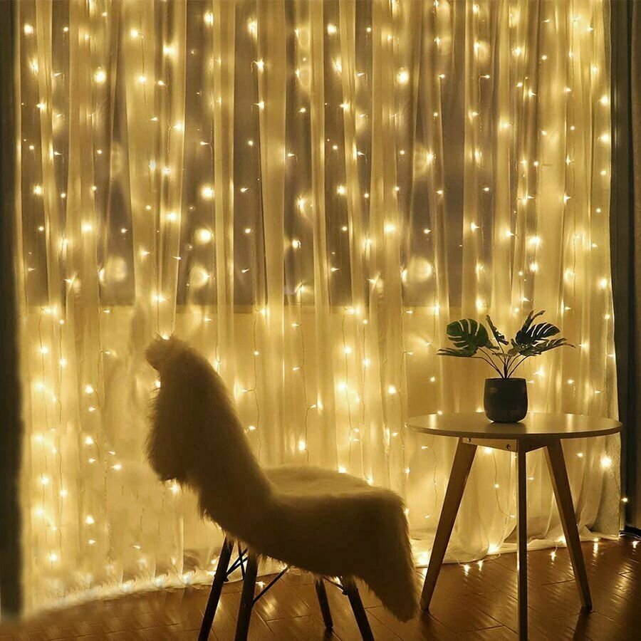 Гирлянда 96 ламп 2х1 м 1 режим Занавес Vegas свет теплый прозрачная на улице/в помещении сетевая LED мигание 6 нитей 55023 Электрогирлянда-конструктор светодиодная Занавес 96 ламп 2x1 м
