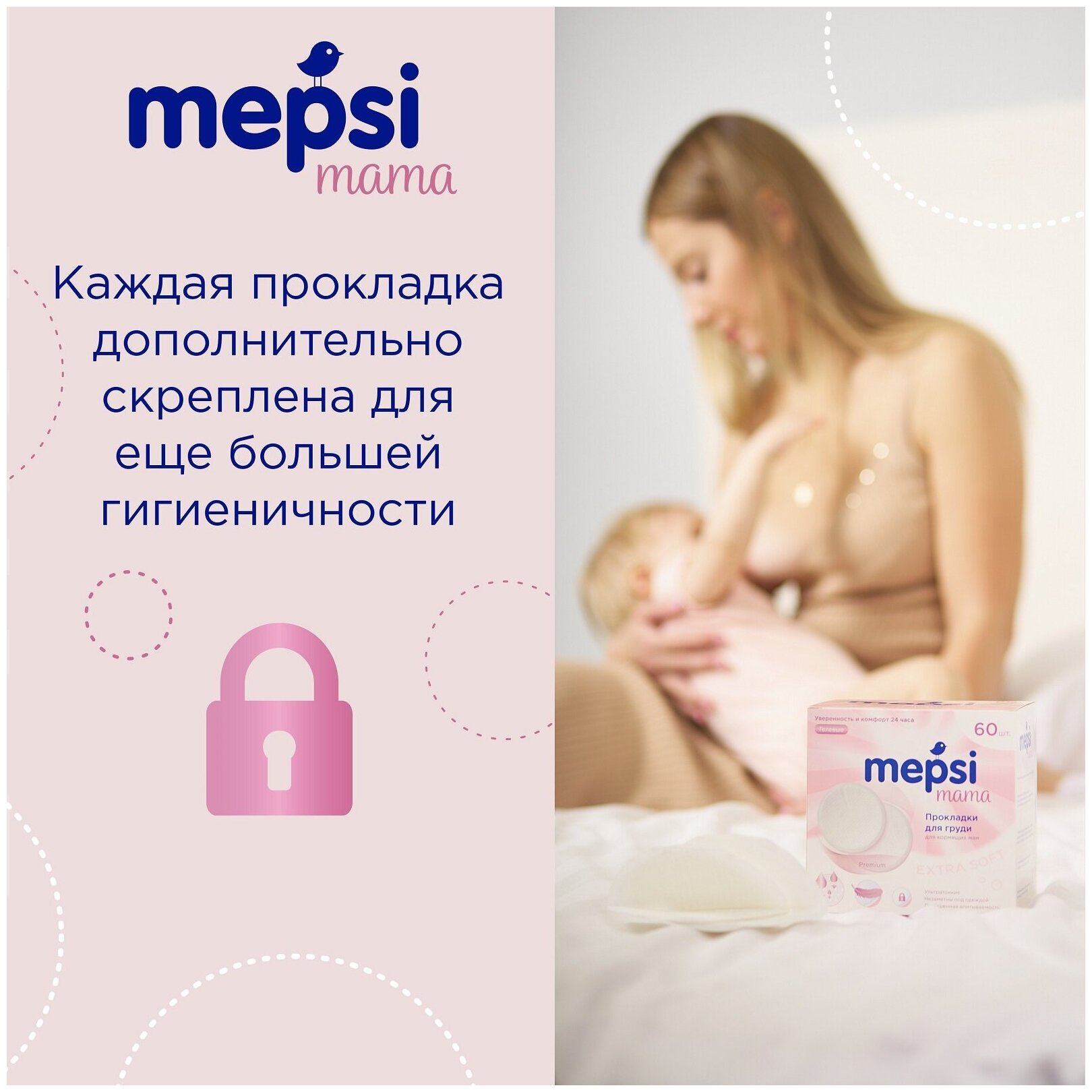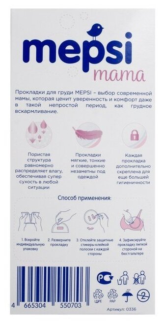Накладки на грудь для кормления MEPSI для кормящих мам, которые ценят уверенность и комфорт, даже в такой непростой период нагрудное вскармливание. Лактационные вкладыши мягкие, тонкие и совершенно незаметны под одеждой. Гелевый абсорбент мгновенно впитывает влагу. Индивидуальная упаковка каждой прокладки. Повышенная впитываемость до 140 мл. Оптимальный размер прокладки. С помощью клейких полосок надежно крепятся к белью. Анатомическая форма прокладки. Внешний дышащий слой позволяет коже дышать и сводит к минимуму риск возникновения раздражения. Вкладыши для груди можно использовать как в дневное, так и в ночное время. Также в ассортименте Mepsi представлены следующие форматы упаковок: - Прокладок для груди послеродовые 30 шт- Прокладок для груди послеродовые 60 шт- Прокладок для груди послеродовые 100 шт