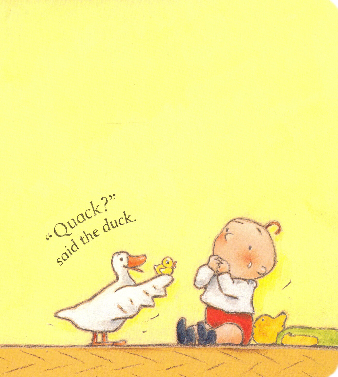 Малыш недоволен, и корова, утка, кошка и собака пытаются придумать, что заставит его перестать плакать. Несколько повторяющихся стишков превращают это в увлекательное чтение вслух для маленькой группы. Кроме того, издавать звуки животных - забавно во время чтения истории вместе. Иллюстрации очень нравятся детям.