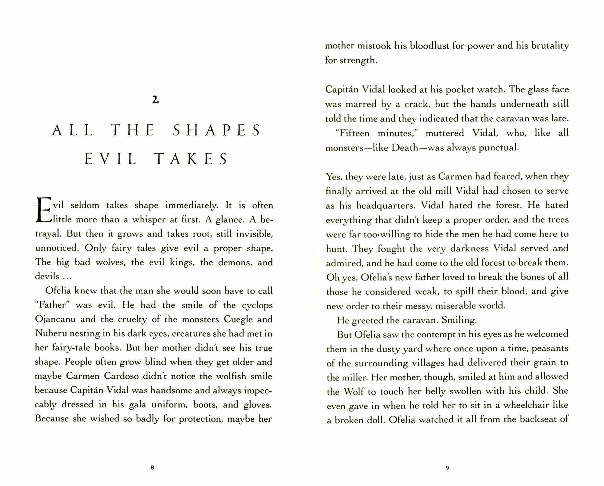 Ofelia knows all this, like any young woman with a head full of stories. And she sees right away what the Capitan is, in his immaculate uniform, boots and gloves, smiling: a wolf.