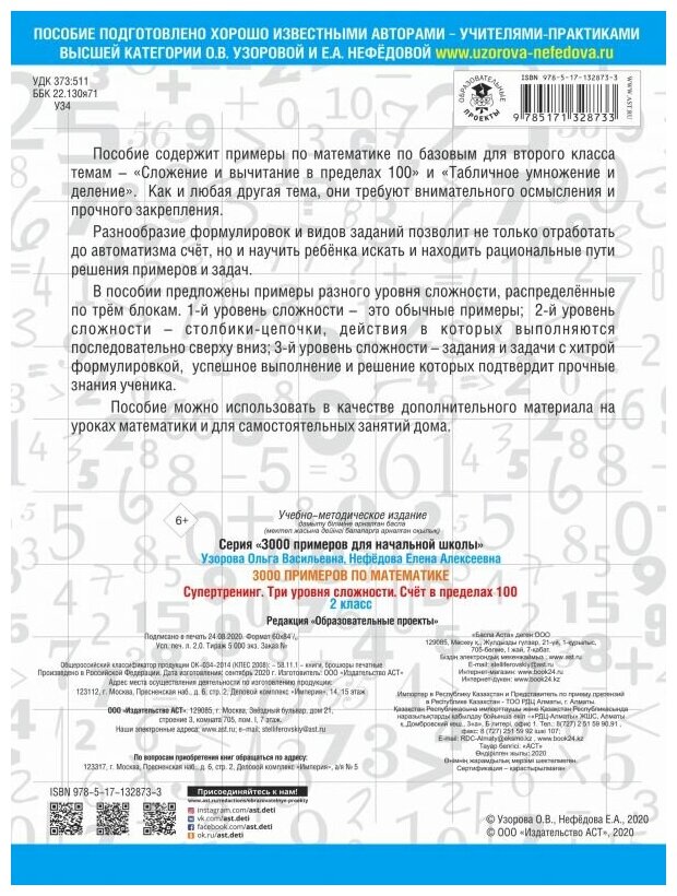 3000 примеров по математике. Супертренинг. Три уровня сложности. Счет в пределах 100. 2 класс (Елена Алексеевна Нефедова, Ольга Васильевна Узорова); АСТ, 2021
