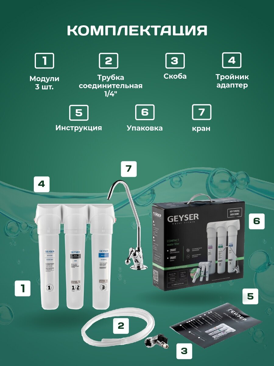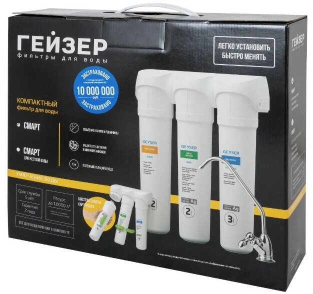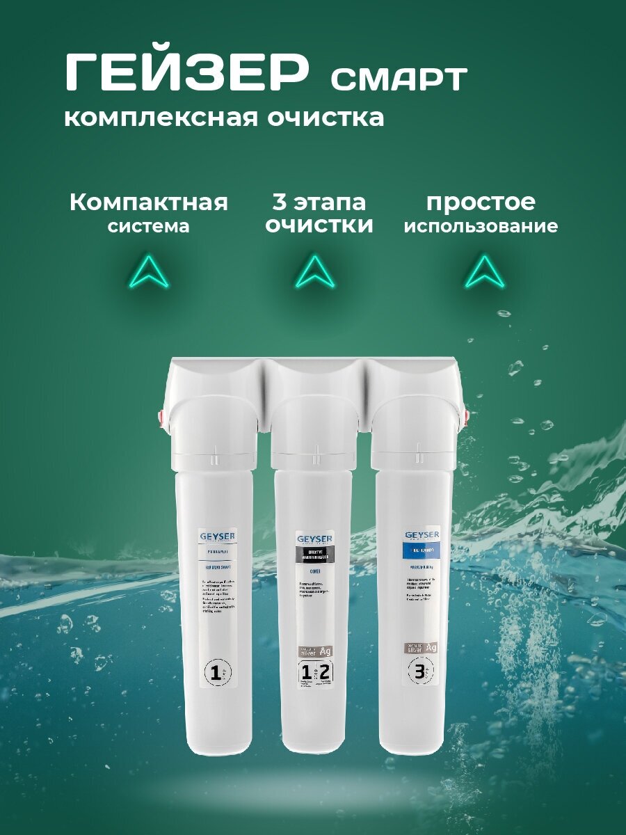 Компактная система Гейзер Смарт обеспечивает гарантированно высокую и эффективную степень очистки воды на протяжении всего срока службы. Гейзер Смарт удаляет все нежелательные загрязнения, умягчает воду и делает её безопасной и полезной для здоровья.