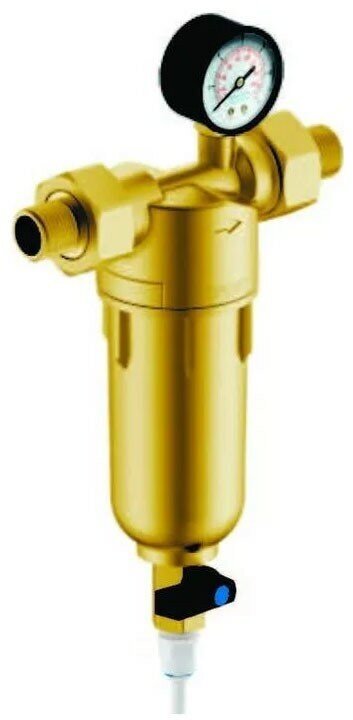 Фильтр c манометром для холодной и горячей воды предназначен для предварительной очистки воды от механических примесей - частиц ржавчины, волокон пеньки, песчинок, что способствует защите сантехники и бытовых установок от воздействия воды. Фильтр состоит из корпуса и промываемого картриджа.