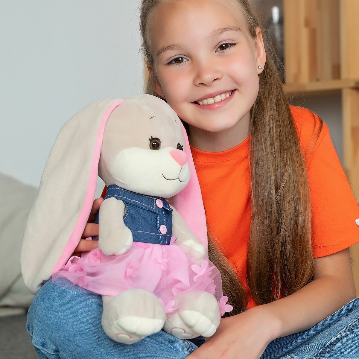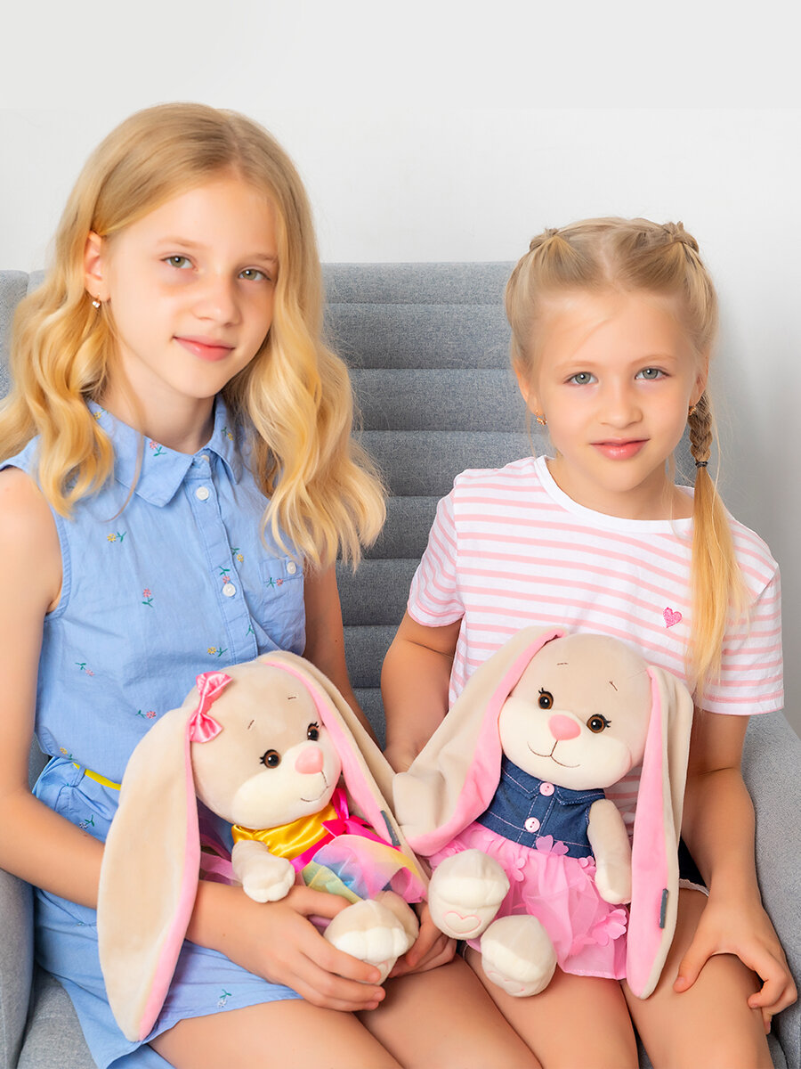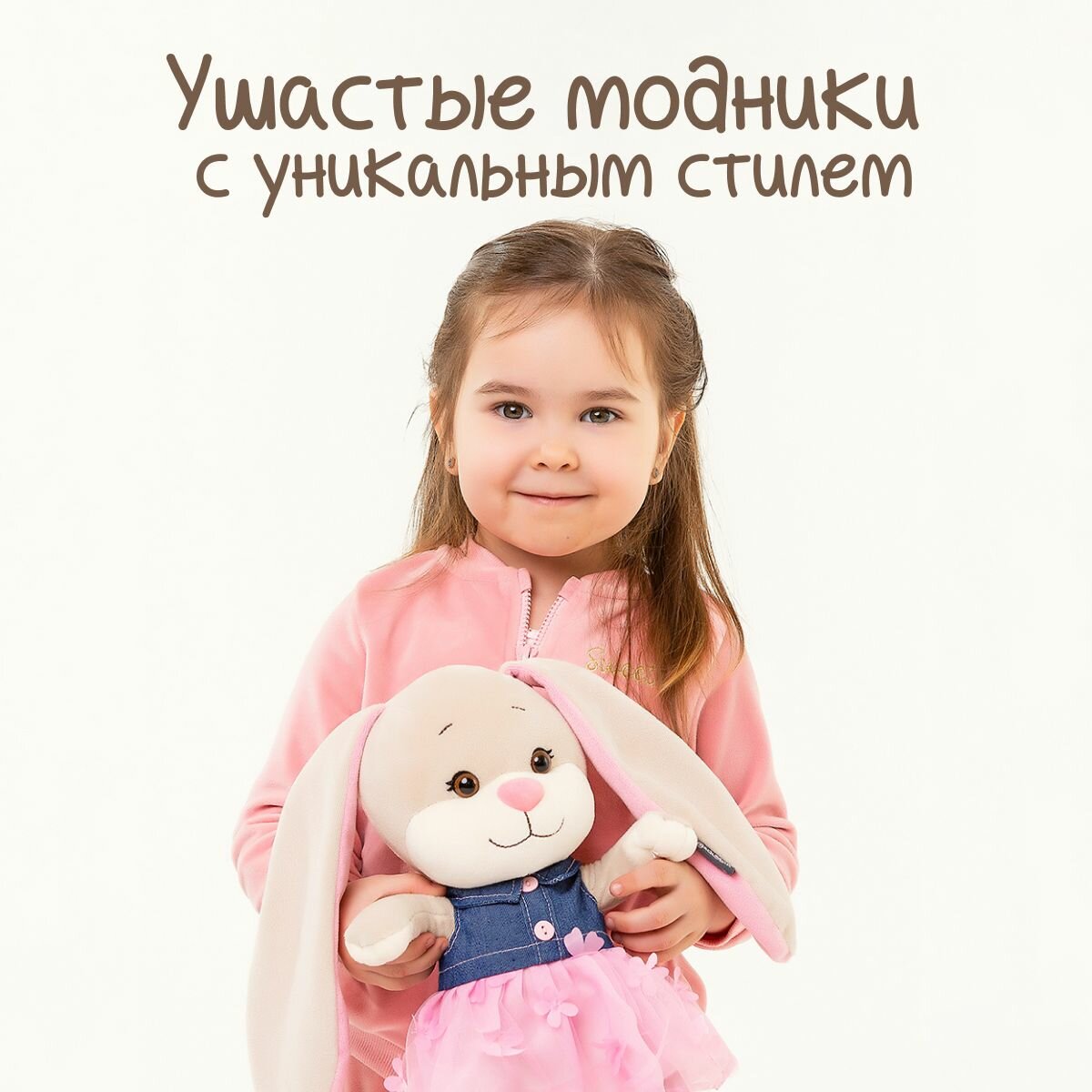 Знакомьтесь: Зайка Лин – отважная искательница приключений! А еще она знает толк в моде! Сегодня она примерила джинсовое платьице с розовой юбочкой, украшенной воздушными цветами. Как раз под цвет ушек и носика. В таком платье она ждет – не дождется, чтобы отправиться в новую интереснейшую поездку — в гости к вашей малышке!