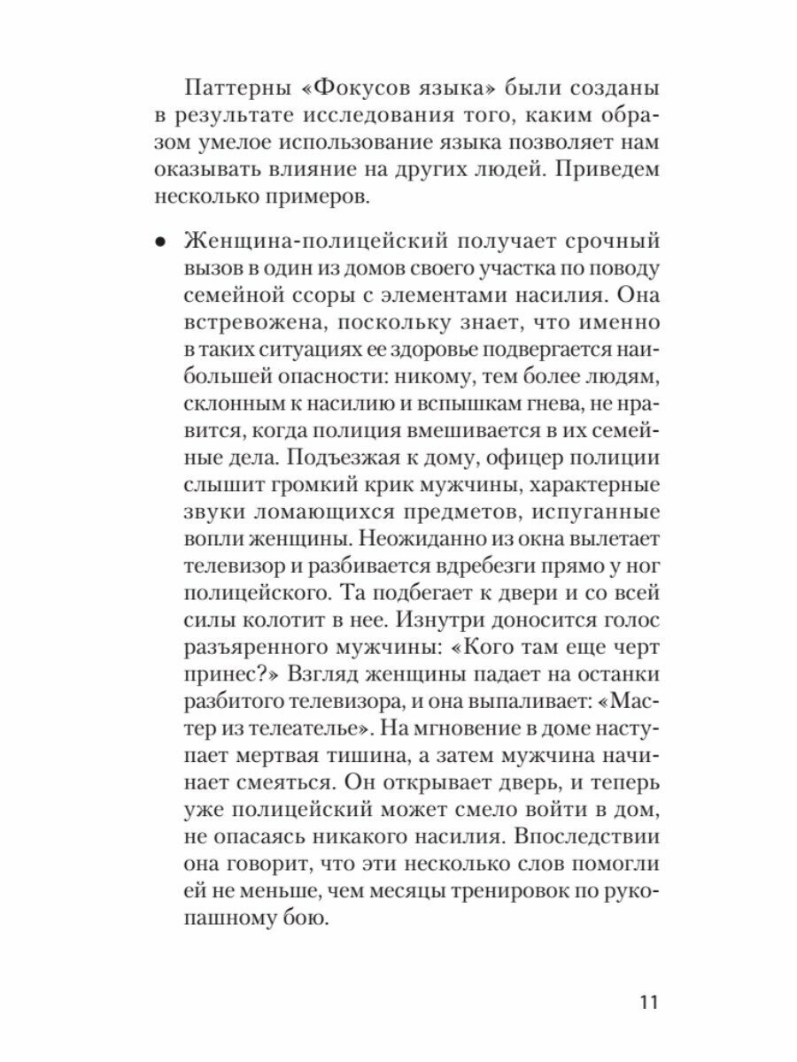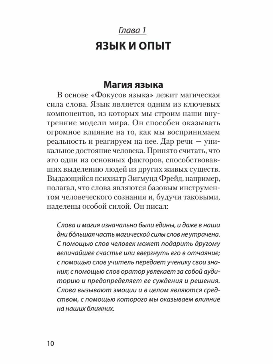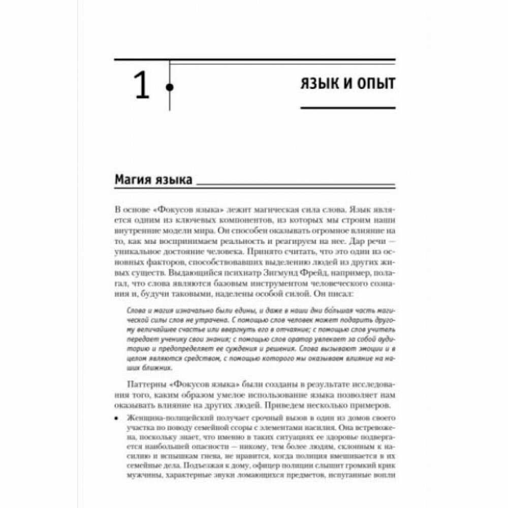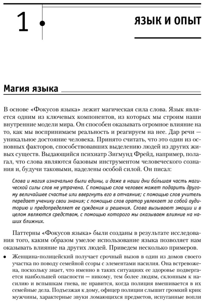 Люди действуют, исходя из своих убеждений. Переубедить бывает очень сложно. Что делать в таких случаях? Использовать "фокусы языка", как предлагает Роберт Дилтс, один из самых известных психологов в области нейролингвистического программирования. Фокусы языка помогают быстро и эффективно менять взгляды и оценки человека. Они используются везде, где мы разговариваем друг с другом: в общении, консультировании, продажах, при решении конфликтов и обучении, и помогают достичь быстрых результатов в переговорах. Прочитав эту книгу, вы освоите важный навык - говорить нужные слова в нужное время.