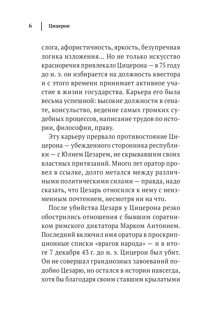 Марк Туллий Цицерон, названный современниками "Отцом Отечества", был в полной мере достоин так именоваться. Убежденный сторонник республики, человек, использовавший свои блестящие ораторские способности для защиты закона (и правды, как он ее понимал), Цицерон оставил огромное литературное наследие — труды по истории, философии, праву и, конечно же, речи. Его произведения дают представление не только о взглядах автора, но и о целой эпохе.
