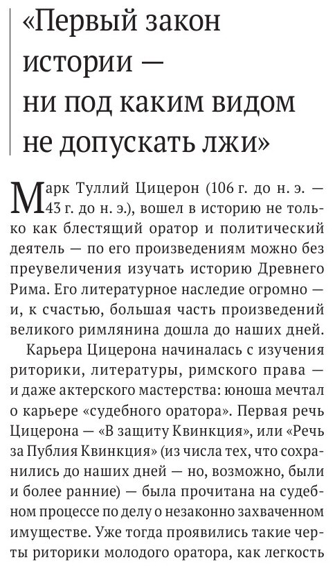 Учить медицину по Гиппократу в наше время – анахронизм. Но в гуманитарной области творения греков и римлян, такие как тексты речей Цицерона, актуальны до сих пор, и я уверен, что еще долго будут интересны и полезны тем, кто хочет преуспеть на ниве красноречия.Вы хотите овладеть ораторским мастерством? Начните с выступлений Цицерона, и я уверен, даже став мастером в этой области, вы будете снова и снова возвращаться к истокам.