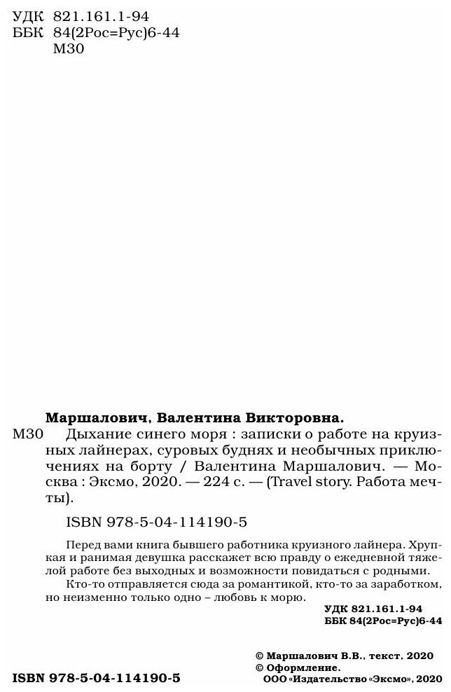 Дыхание синего моря. Записки о работе на круизном лайнере суровых буднях и необычных приключениях (Маршалович Валентина Викторовна); ООО "Издательство "Эксмо", 2020