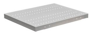 Полка предназначена для размещения тяжелого оборудования и способна выдерживать установку устройств весом до 300 кг. Максимальная распределенная нагрузка может превышать данный показатель. Конструктивная жесткость полки обеспечивается дополнительными ребрами жесткости с обратной стороны полки и измененной усиленной конструкцией полки.