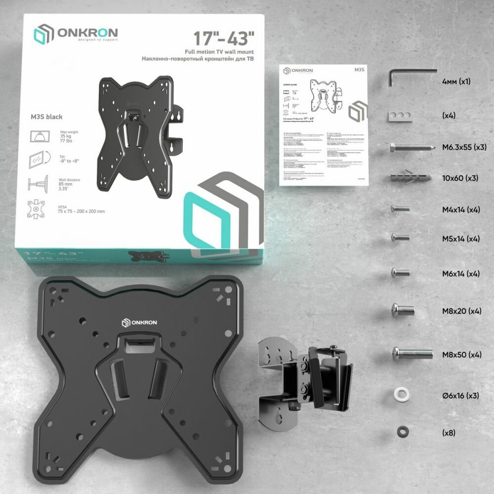 - ONKRON кронштейн для телевизора M3S 17"-42" наклонно-поворотный, чёрный