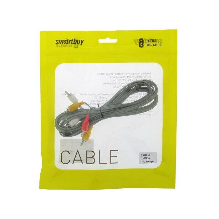 Шнур 3х3 RCA 3М REXANT предназначен для одновременной передачи аналогового видео и аудиосигнала (STEREO) и широко применяется для теле и аудиосистем. С обеих сторон шнура располагаются по три штекера разъема RCA (традиционный стандарт для аналоговой видео и аудиотехники). Шнур используется для совместной эксплуатации домашней и профессиональной аудиоаппаратуры (электронные музыкальные инструменты, усилители звука, телевизоры, видеомагнитофоны, ресиверы, спутниковые ресиверы и т.д.), с разъемами такого типа. Разъемы выполнены из лёгкого и прочного пластика, а контакты никелированы. Длина шнура составляет 3 метра.